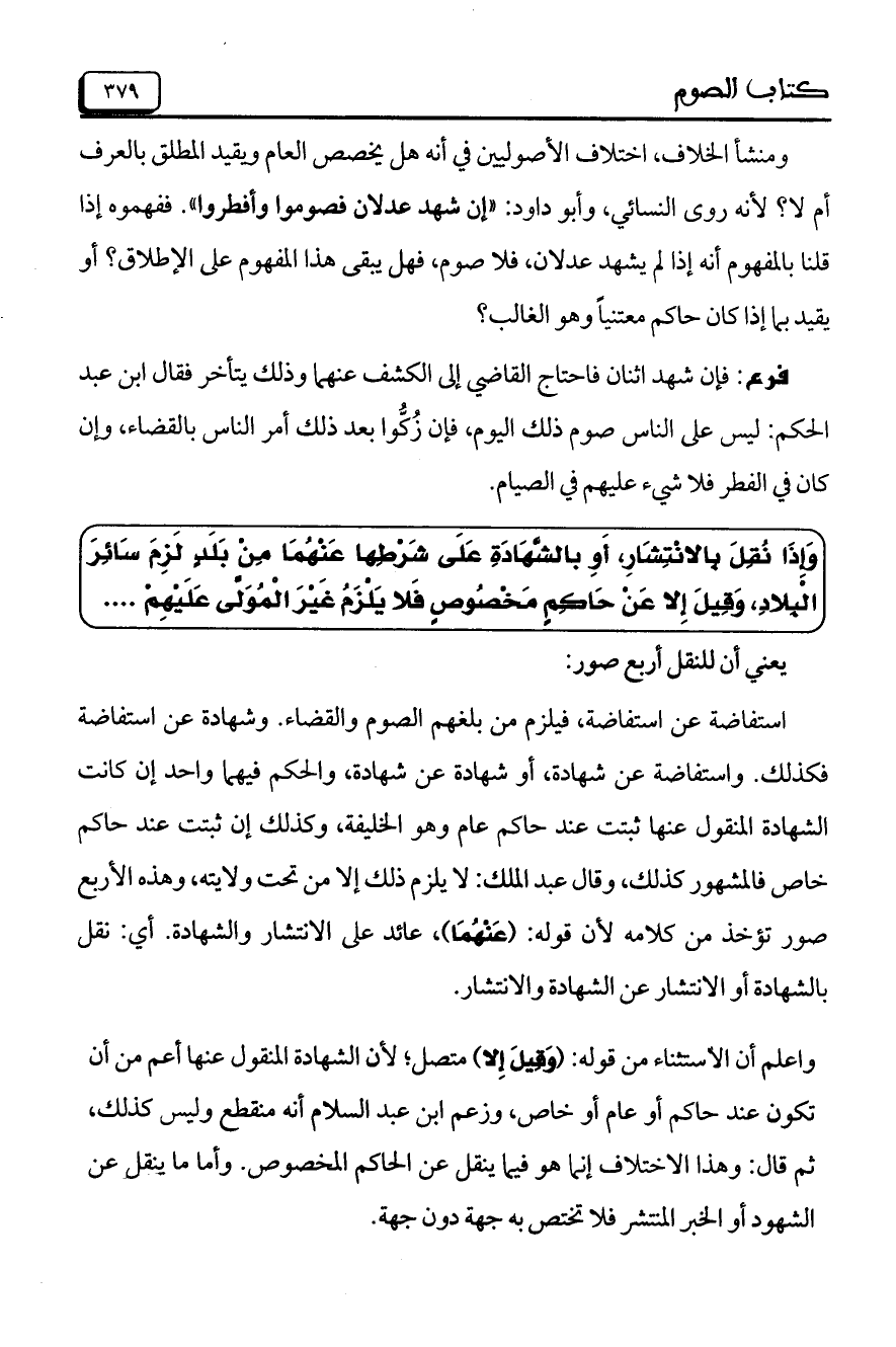 ومنشأ الخلاف، اختلاف الأصوليين في أنه هل يخصص العام ويقيد المطلق بالعرف أم لا؟ لأنه روى النسائي، وأبو داود: "إن شهد عدلان فصوموا وأفطروا". ففهموه إذا قلنا بالمفهوم أنه إذا لم يشهد عدلان، فلا صوم، فهل يبقى هذا المفهوم على الإطلاق؟ أو يقيد بما إذا كان حاكم معتنيا وهو الغالب؟