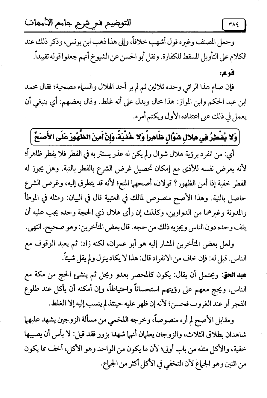 أى: من انفرد بؤية هلال شوال ولم يكن له عذر يستتر به فى الفطر فلا يفطر ظاهرا؛ لأنه يعض نفسه للأذى مع إمكان تحصيل غرض الشرع بالفطر بالنية. وهل يجوز له الفطر خفية إذا أمن الظهور؟ قولان، أصحهما المنع؛ لأنه قد يتطرق اليه، وغرض الشرع حاصل بالنية. وهذا الأصح منصوص لمالك فى العتبية قال فى البيان: ومثله فى الموطأ والمدونة وغيرهما من الدواوين، وكذلك إن رأى هلال ذى الحجة وحده يجب عليه أن يقف وحده دون الناس ويجزيه ذلك من حجه. قال بعض المتأخين: وهو صحيح. انتهى.