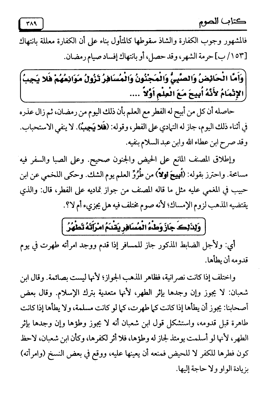 واختلف إذا كانت نصرانية، فظاهر المذهب الجواز؛ لأنها ليست بصائمة. وقال ابن شعبان: لا يجوز وإن وجدها بإثر الطهر، لأنها متعدية بترك الإسلام. وقال بعض أصحابنا: يجوز أن يطأها إذا كانت كما طهرت، كما لو كانت مسلمة، ولا يطأها إذا كانت طاهرة قبل قدومه، واستشكل قول ابن شعبان أنه لا يجوز وطؤها وإن وجدها بإثر الطهر، لأنها لو أسلمت يومئذٍ لجاز له وطؤها، فلا أثر لكفرها، وكأن ابن شعبان، لاحظ كون فطرها للكفر لا للحيض فمنعه أن يعينها عليه، ووقع في بعض النسخ (وامرأته) بزيادة الواو ولا حاجة إليها.