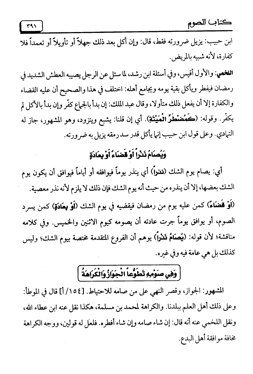 المشهور: الجواز، وقصر النهي على من صامه للاحتياط. [154/ أ] قال في الموطأ: وعلى ذلك أهل العلم ببلدنا. والكراهة لمحمد بن مسلمة، هكذا نقل عنه ابن عطاء الله، ونقل اللخمي عنه أنه قال: إن شاء صامه وإن شاء أفطره. فلعل له قولين، ووجه الكراهة مخافة موافقة أهل البدع.