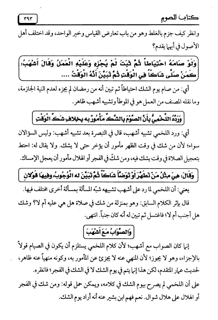 إنما كان الصواب مع أشهب؛ لأن كلام اللخمي يستلزم أن يكون في الصيام قولاً بالإجزاء، وهو لا يجوز؛ لأن المنهي عنه لا يجزئ عن المأمور به، وكونه منهياً عنه ظاهر، لحديث عمار المتقدم، لكن هذا إنما يتم في يوم الشك لا في الشك في الفجر؛ فانظره.