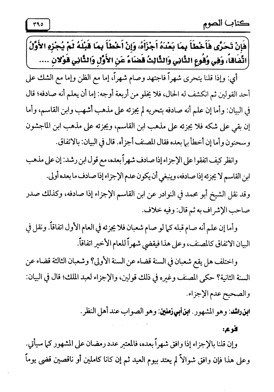 وانظر كيف اتفقوا على الإجزاء إذا صادف شهراً بعده، مع قول ابن رشد: إن على مذهب ابن القاسم لا يجزئه إذا صادفه، وينبغي أن يكون عدم الإجزاء إذا صادف ما بعده أولى.