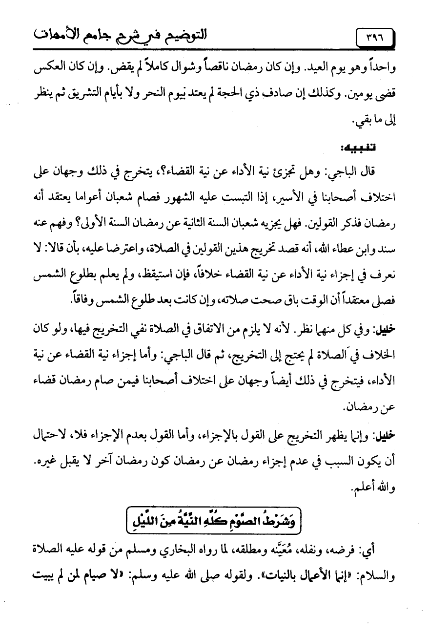 خليل: وفي كل منهما نظر. لأنه لا يلزم من الاتفاق في الصلاة نفي التخريج فيها، ولو كان الخلاف في الصلاة لم يحتج إلى التخريج، ثم قال الباجي: وأما إجزاء نية القضاء عن نية الأداء، فيتخرج في ذلك أيضاً وجهان على اختلاف أصحابنا فيمن صام رمضان قضاء عن رمضان.