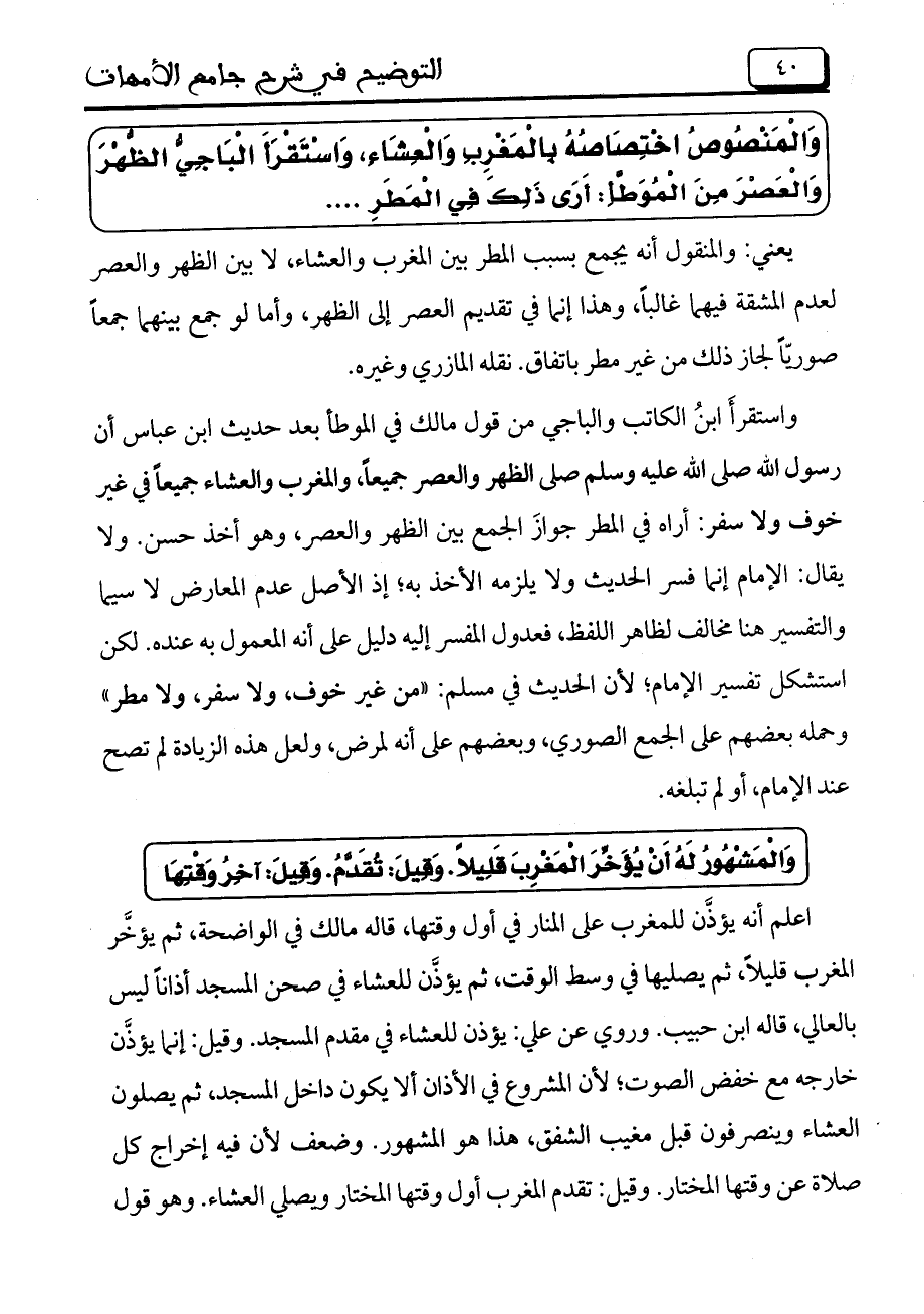 واستقرأ ابن الكاتب والباجي من قول مالك في الموطأ بعد حديث ابن عباس أن رسول الله صلى الله عليه وسلم صلى الظهر والعصر جميعاً، والمغرب والعشاء جميعاً في غير خوف ولا سفر: أراه في المطر جوازَ الجمع بين الظهر والعصر، وهو أخذ حسن. ولا يقال: الإمام إنما فسر الحديث ولا يلزمه الأخذ به؛ إذ الأصل عدم المعارض لا سيما والتفسير هنا مخالف لظاهر اللفظ، فعدول المفسر إليه دليل على أنه المعمول به عنده. لكن استشكل تفسير الإمام؛ لأن الحديث في مسلم: "من غير خوف، ولا سفر، ولا مطر" وحمله بعضهم على الجمع الصوري، وبعضهم على أنه لمرض، ولعل هذه الزيادة لم تصح عند الإمام، أو لم تبلغه.