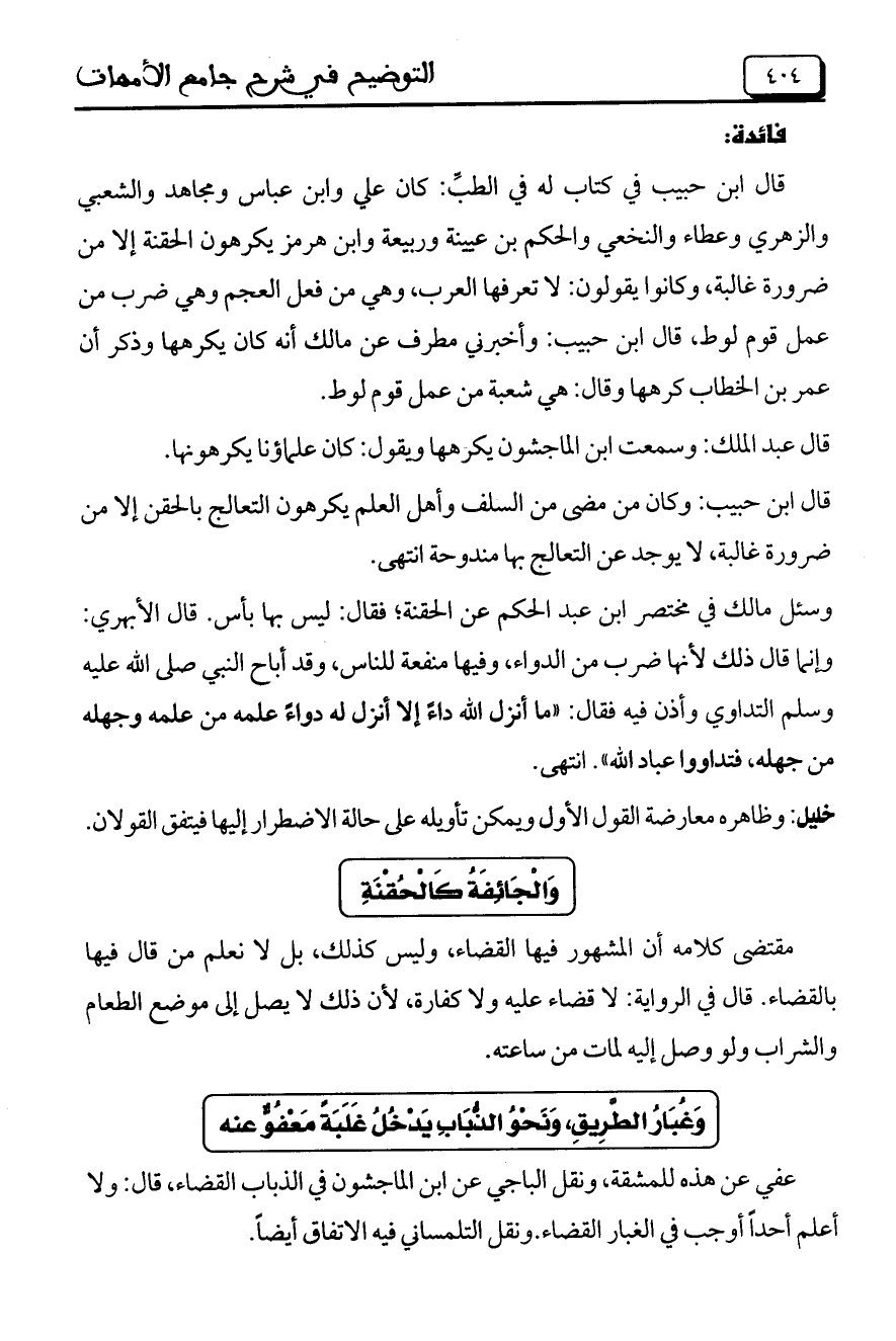 قال ابن حبيب: وكان من مضى من السلف وأهل العلم يكرهون التعالج بالحقن إلا من ضرورة غالبة، لا يوجد عن التعالج بها مندوحة انتهى.
