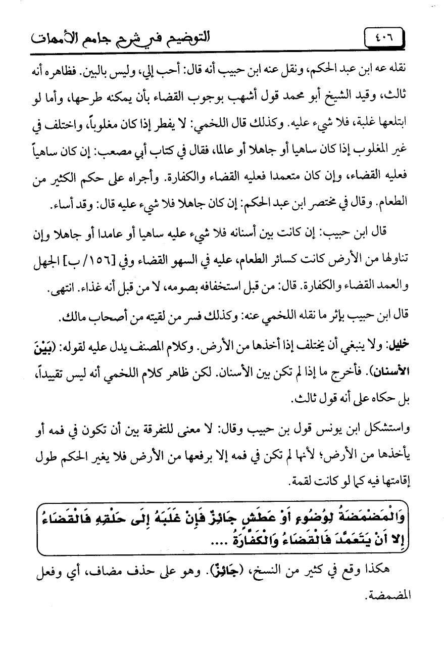 وَالْمَضْمَضَةُ لِوُضُوءٍ أَوْ عَطَشٍ جَائِزٌ فَإِنْ غَلَبَهُ إِلَى حَلْقِهِ فَالْقَضَاءُ إِلا أَنْ يَتَعَمَّدَ فَالْقَضَاءُ وَالْكَفَّارَةُ ....
