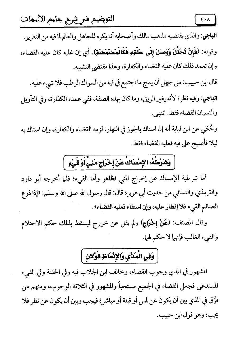 المشهور في المذي وجوب القضاء، وخالف ابن الجلاب فيه وفي الحقنة وفي القيء المستدعي فجعل القضاء في الجميع مستحباً والمشهور في الثلاثة الوجوب، ومنهم من فرَّق في المذي بين أن يكون عن لمس أو قبله أو مباشرة فيجب وبين أن يكون عن نظر فلا يجب؛ وهو قول ابن حبيب.