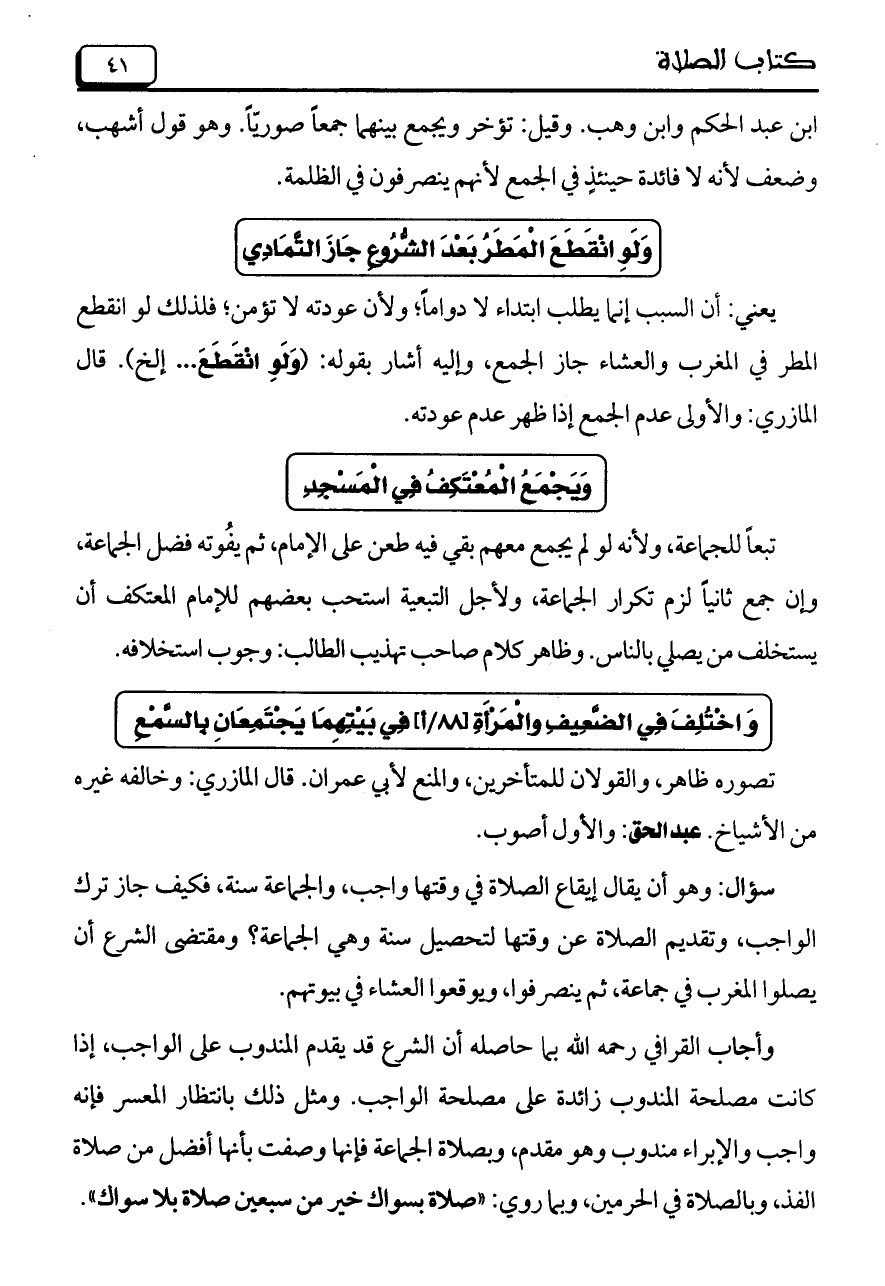 سؤال: وهو أن يقال إيقاع الصلاة في وقتها واجب، والجماعة سنة، فكيف جاز ترك الواجب، وتقديم الصلاة عن وقتها لتحصيل سنة وهي الجماعة؟ ومقتضى الشرع أن يصلوا المغرب في جماعة، ثم ينصرفوا، ويوقعوا العشاء في بيوتهم.