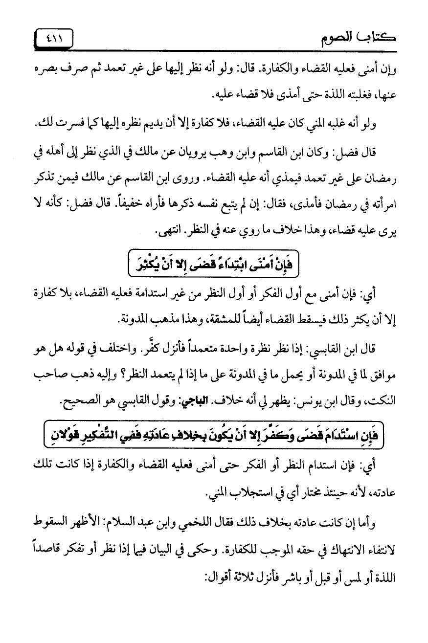 قال فضل: وكان ابن القاسم وابن وهب يرويان عن مالك في الذي نظر إلى أهله في رمضان على غير تعمد فيمذي أنه عليه القضاء. وروى ابن القاسم عن مالك فيمن تذكر امرأته في رمضان فأمذى، فقال: إن لم يتبع نفسه ذكرها فأراه خفيفاً. قال فضل: كأنه لا يرى عليه قضاء، وهذا خلاف ما روي عنه في النظر. انتهى.