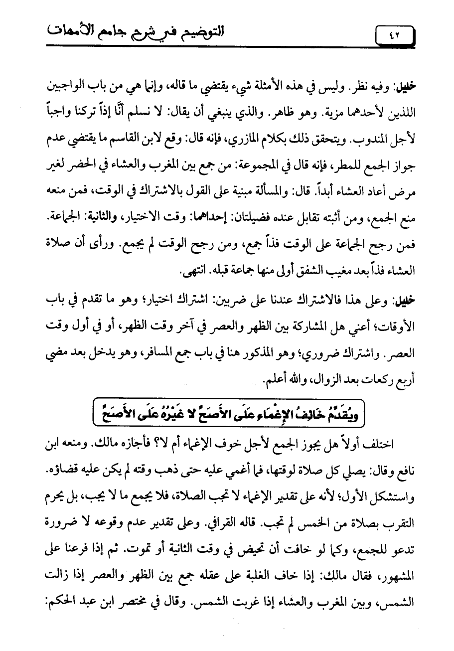 خليل: وفي نظر. وليس في هذه الأمثلة شيء يقتضي ما قاله، وإنما هي من باب الواجبين اللذين لأحدهما مزية. وهو ظاهر. والذي ينبغي أن يقال: لا نسلم أنَّا إذا تركنا واجباً لأجل المندوب. ويتحقق ذلك بكلام المازري، فإنه قال: وقع لابن القاسم ما يقتضي عدم جواز الجمع للمطر، فإنه قال في المجموعة: من جمع بين المغرب والعشاء في الحضر لغير مرض أعاد العشاء أبداً. قال: والمسألة مبنية على القول بالاشتراك في الوقت، فمن منعه منع الجمع، ومن أثبته تقابل عنده فضيلتان: إحداهما: وقت الاختيار، والثانية: الجماعة. فمن رجح الجماعة على الوقت فذاً جمع، ومن رجح الوقت لم يجمع. ورأى أن صلاة العشاء فذاً بعد مغيب الشفق أولى منها جماعة قبله. انتهى.