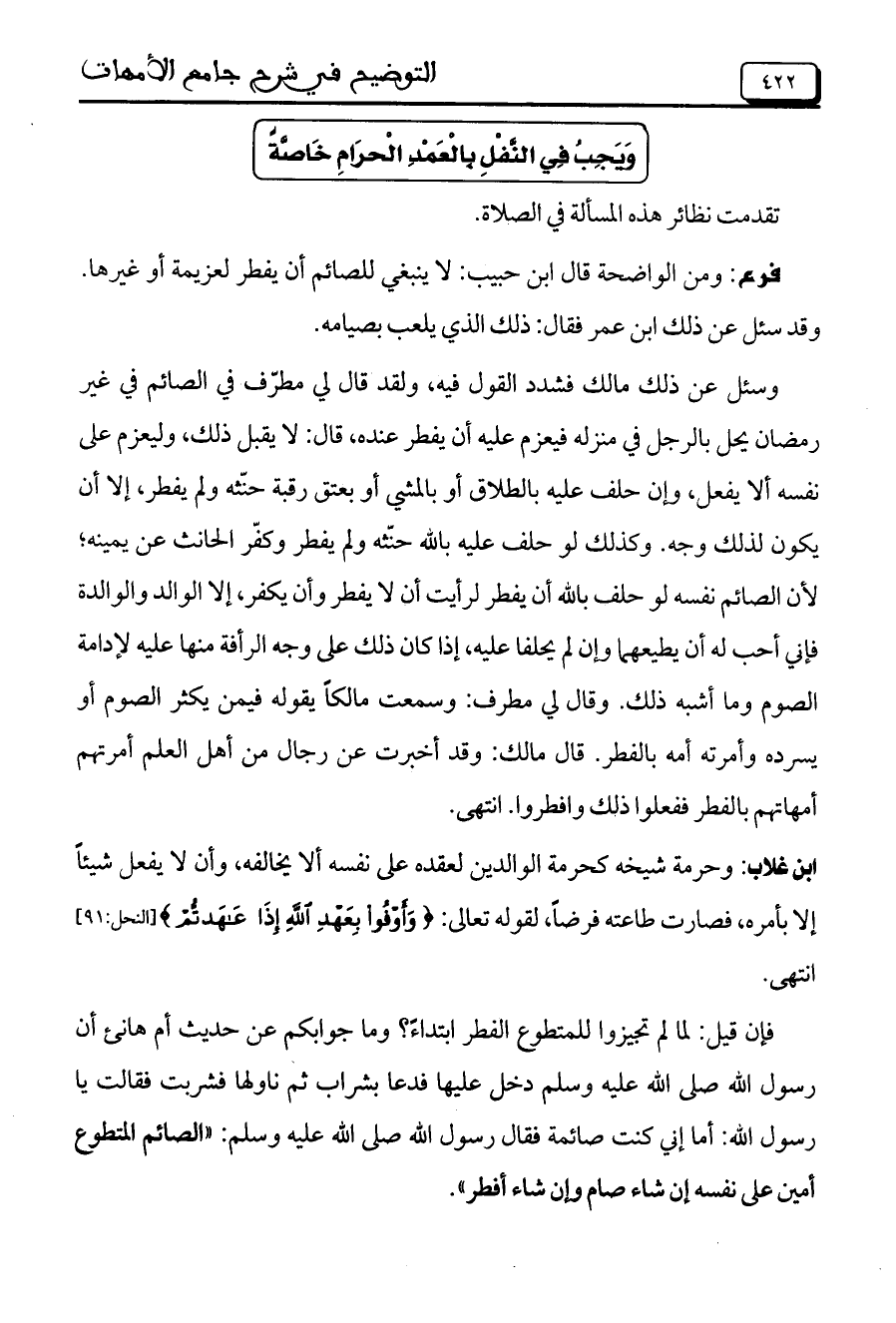 وسئل عن ذلك مالك فشدد القول فيه، ولقد قال لي مطرّف في الصائم في غير رمضان يحل بالرجل في منزله فيعزم عليه أن يفطر عنده، قال: لا يقبل ذلك، وليعزم على نفسه ألا يفعل، وإن حلف عليه بالطلاق أو بالمشيء أو بعتق رقبة حنثه ولم يفطر، إلا أن يكون لذلك وجه. وكذلك لو حلف عليه بالله حنثه ولم يفطر وكفّر الحانث عن يمينه؛ لأن الصائم نفسه لو حلف بالله أن يفطر لرأيت ان لا يفطر وأن يكفر، إلا الوالد والوالدة فإني أحب له أن يطيعهما وإن لم يحلفا عليه، إذا كان ذلك على وجه الرأفة منها عليه لإدامة الصوم وما أشبه ذلك. وقال لي مطرف: وسمعت مالكاً يقوله فيمن يكثر الصوم أو يسرده وأمرته أمه بالفطر. قال مالك: وقد أخبرت عن رجال من أهل العلم أمرتهم أمهاتهم بالفطر ففعلوا ذلك وافطروا. انتهى.