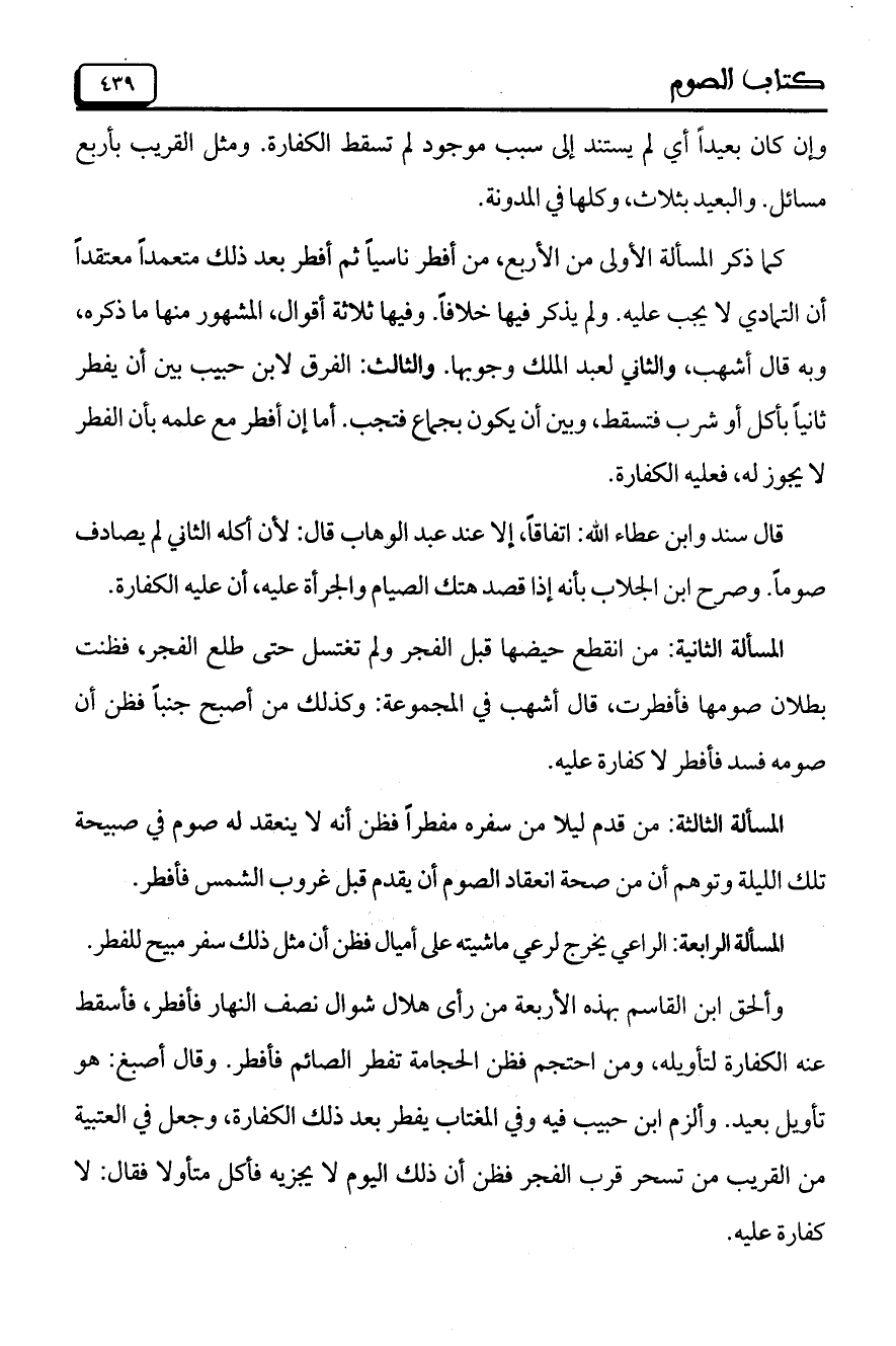 المسألة الثانية: من انقطع حيضها قبل الفجر ولم تغتسل حتى طلع الفجر، فظنت بطلان صومها فأفطرت، قال أِهب في المجموعة: وكذلك من أصبح جنباً فظن أن صومه فسد فأفطر لا كفارة عليه.