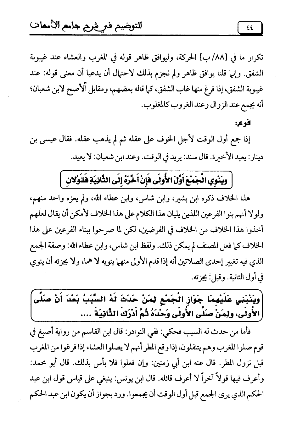 تكرار ما في] 88/ب [الحركة، وليوافق ظاهر قوله في المغرب والعشاء عند غيبوبة الشفق. وإنما قلنا يوافق ظاهر ولم نجزم بذلك لاحتمال أن يدعيا أن معنى قوله: عند غيبوبة الشفق، إذا فر منها غاب الشفق، كما قاله بعضهم، ومقابل الأصح لابن شعبان؛ أنه يجمع عند الزوال وعند الغروب كالمغلوب.