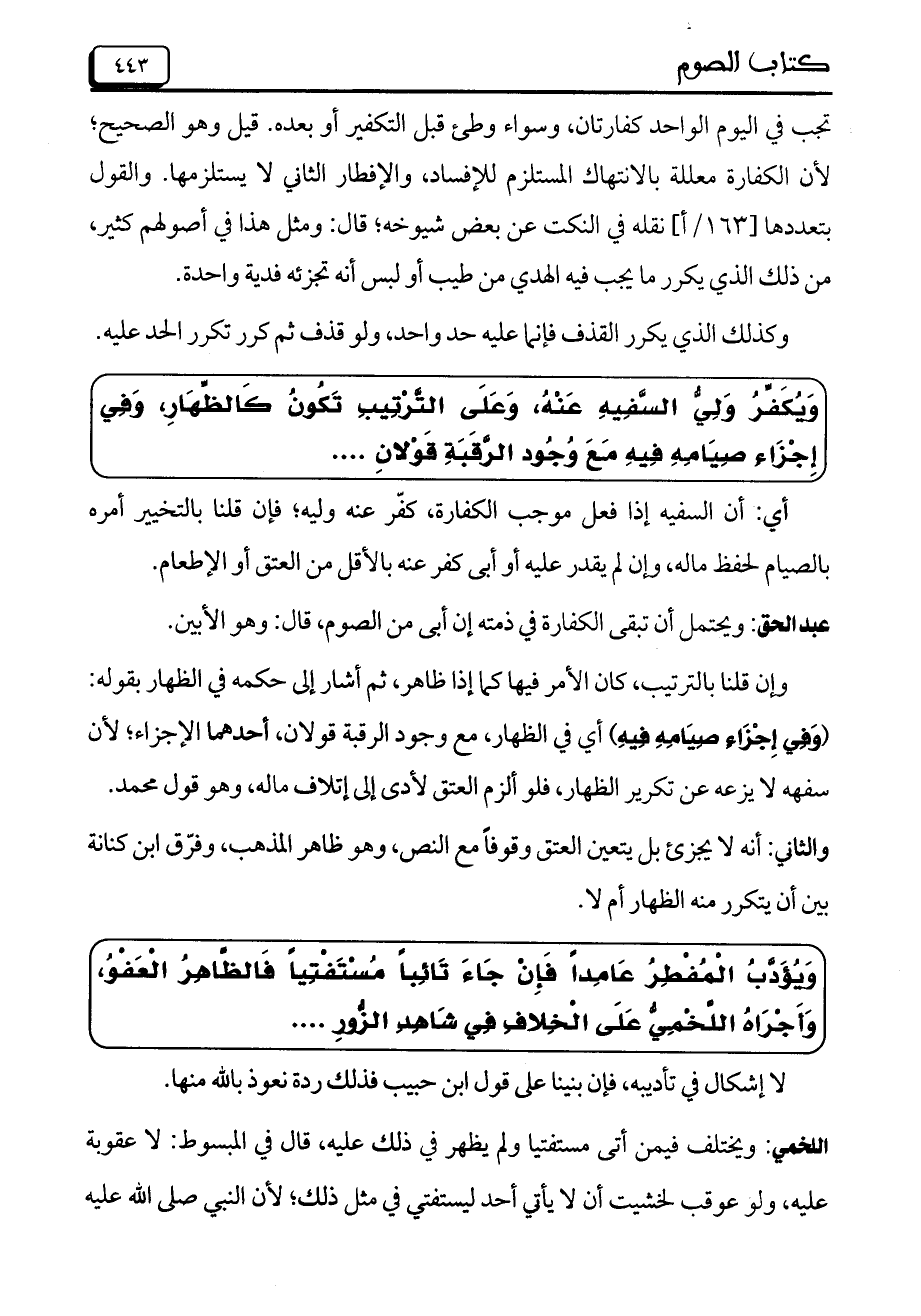 تجب في اليوم الواحد كفارتان، وسواء وطئ قبل التكفير أو بعده. قيل وهو الصحيح؛ لأن الكفارة معللة بالانتهاك المستلزم للإفساد، والإفطار الثاني لا يستلزمها. والقول بتعددها [163/أ] نقله في النكت ع بعض شيوخه؛ قال: ومثل هذا في أصولهم كثير، من ذلك الذي يكرر ما يجب فيه الهدي من طيب أو لبس أنه تجزئة فدية واحدة.