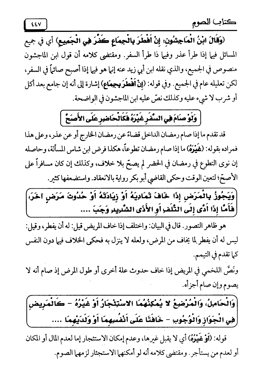(وَقَالَ ابْنُ الْمَاجِشُونِ: إِنْ أَفْطَرَ بالْجِمَاعِ كَفَّرَ في الْجَمِيعِ) أي في جميع المسائل فيما إذا طرأ عذر وفيما ذا طرأ السفر. ومقتضى كلامه أن قول ابن الماجشون منصوص في الجميع، والذي نقله ابن أبي زيد عنه إنما هو فيما إذا أصبح صائماً في السفر، لكن تعليله علام في الجميع. وفي قوله: (إِنْ أَفْطَرَ بِجِمَاع) إشارة إلى أنه إن جامع بعد أكل أو شرب لا شيء عليه وكذلك نص عليه ابن الماجشون في الواضحة.