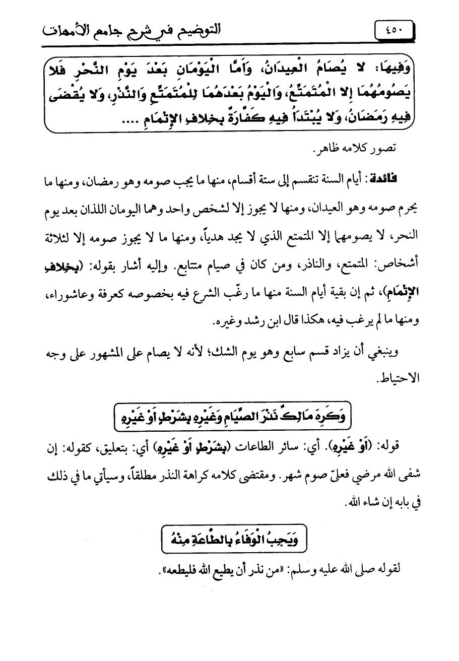 فائدة: أيام السنة تنقسم إلى ستة أقسام، منها ما يجب صومه وهو رمضان، ومنها ما يحرم صومه وهو العيدان، ومنها لايجوز إلا لشخص واحد وهما اليومان اللذان بعد يوم النحر، لا يصومهما إلا المتمتع الذي لاي جد هدياً، ومنها ما لا يجوز صومه إلا لثلاثة أشخاص: المتمتع، والناذر، ومن كان في صيام متتابع. وإليه أشار بقوله: (بِخِلافٍ الإتْمَامِ)، ثم إن بقية أيام السنة منها ما رغّب الشرع فيه بخصوصه كعرفة وعاشوراء، ومنها ما لم يرغب فيه، هكذا قال ابن رشد وغيره.