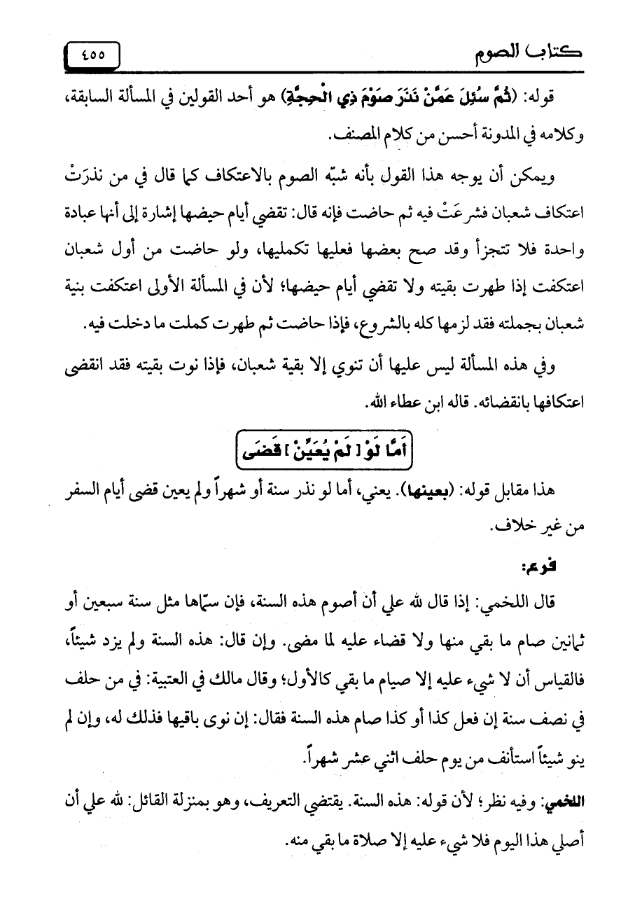 اللخمي: وفيه نظر؛ لأن قوله: هذه السنة. يقتضي التعريف، وهو بمنزلة القائل: لله علي أن أصلي هذا اليوم فلا شيء عليه إلا صلاة ماب قي منه.