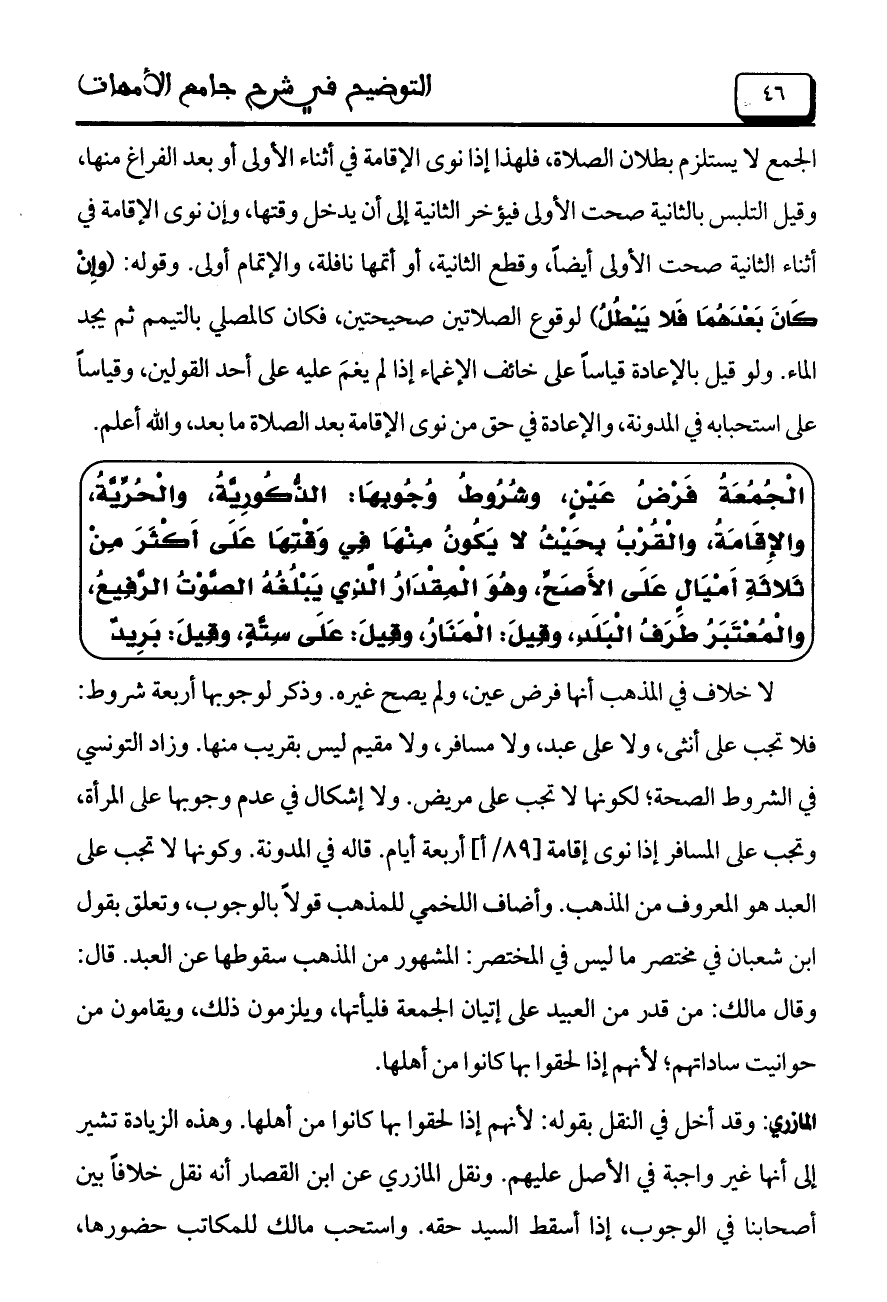 لا خلاف في المذهب أنها فرض عين، ولم يصح غيره. وذكر لوجوبها أربعة شروط: فلا تجب على أنثى، ولا على عبد، ولا مسافر، ولا مقيم ليس بقريب منها. وزاد التونسي في الشروط الصحة؛ لكونها لا تجب على مريض. ولا إشكال في عدم وجوبها على المرأة، وتجب على المسافر إذا نوى إقامة] 89/أ [أربعة أيام. قاله في المدونة. وكونها لا تجب على العبد هو المعروف من المذهب. وأضاف اللخمي للمذهب قولاً بالوجوب، وتعلق بقول ابن شعبان في مختصر ما ليس في المختصر: المشهور من المذهب سقوطها عن العبد. قال: وقال مالك: من قدر من العبيد على إتيان الجمعة فليأتها، ويلزمون ذلك، ويقامون من حوانيت ساداتهم؛ لأنهم إذا لحقوا بها كانوا من أهلها.