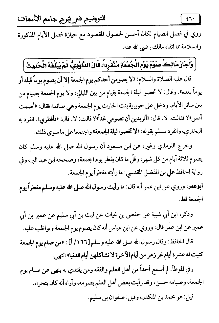قال عليه الصلاة والسلام: "لا يصومن أحدكم يوم الجمعة إلا أن يصوم يوماً قبله أو يوماً بعده". قوال: لا تخصوا ليلة الجمعة بقيام من بين الليالي، ولا يوم الجمعة بصيام من بين سائر الأيام. ودخل على جويرية بنت الحارث يوم الجمعة وهي صائمة فقال: "أصمت أمس"؟ فقالت: لا. قال: "أتريدين أن تصومي غداً؟ قالت: لا. قال: "فأفطري". انفرد به البخاري، وانفرد مسلم بقوله:"لا تخصوا ليلة الجمعة" واجتمعا على ما سوى ذلك.