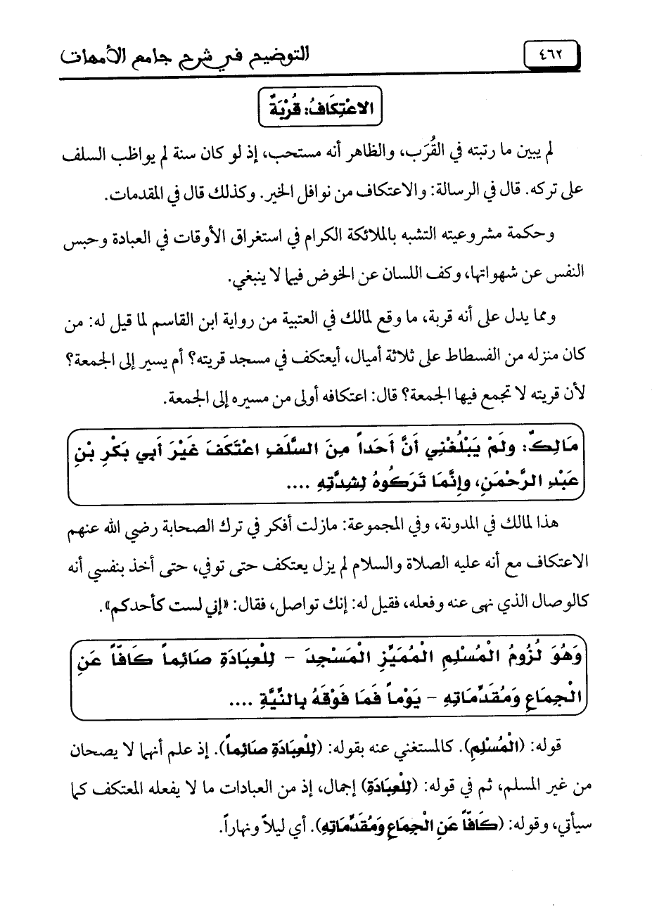 ومما يدل على أنه قربة، ما وقع لمالك في العتبية من رواية ابن القاسم لما قيل له: من كان منزله من الفسطاط على ثلاثة أميال، أيعتكف في مسجد قريته؟ أم يسير إلى الجمعة؟ لأن قريته لا تجمع فيها الجمعة؟ قال: اعتكافه أولى من مسيره إلى الجمعة.