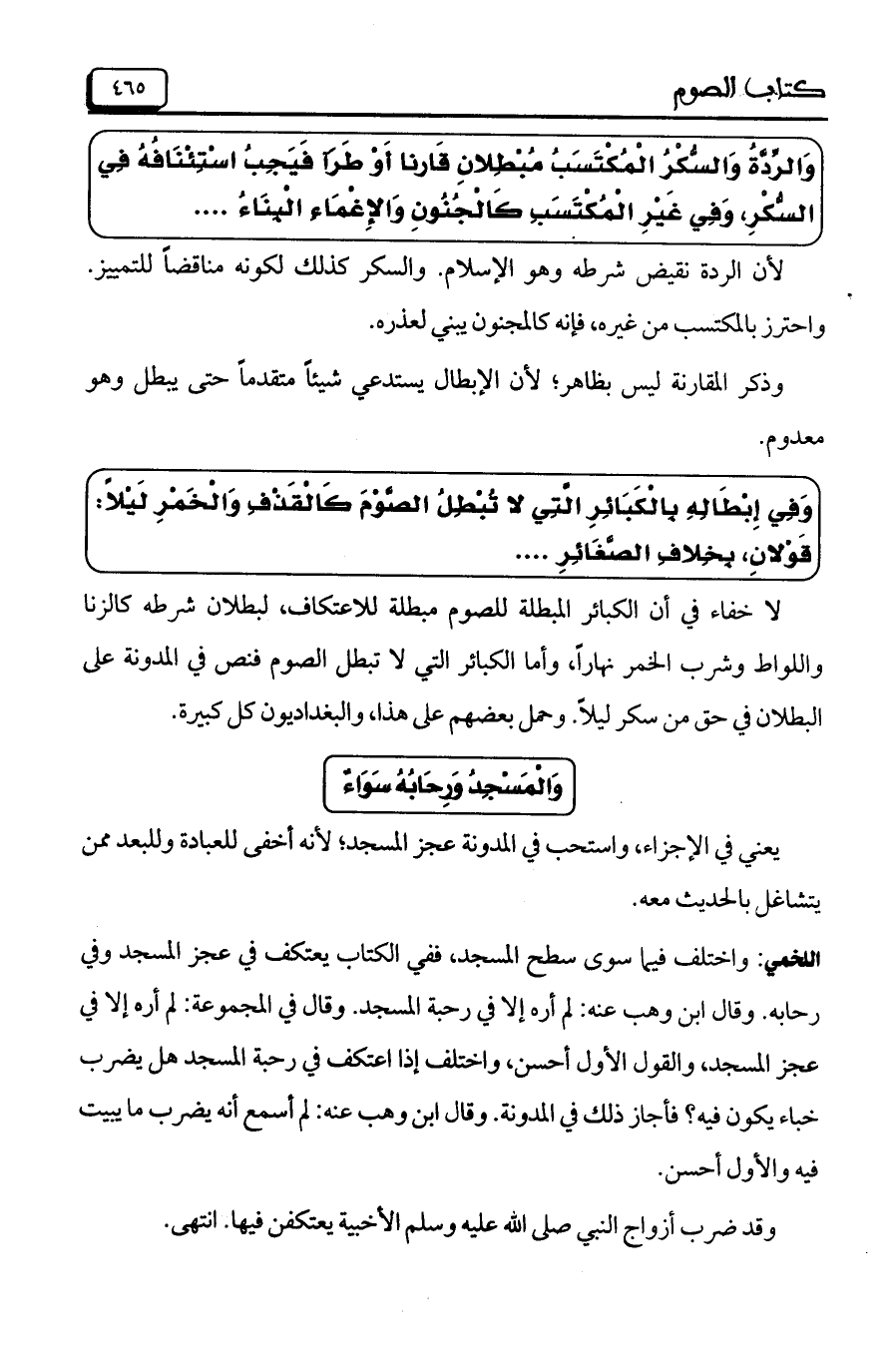 اللخمي: واختلف فيما سوى سطح المسجد، ففي الكتاب يعتكف في عجز المسجد وفي رحابه. وقال ابن وهب عنه: لم أره إلا في رحبة المسجد. وقال في المجموعة: لم أره إلا في عجز المسجد، والقول الأول أحسن، واختلف إذا اعتكف في رحبة المسجد هل يضرب خباء يكون فيه؟ فأجاز ذلك في المدونة. وقال ابن وهب عنه لم أسمع أنه يضرب ما يبيت فيه والأول أحسن.