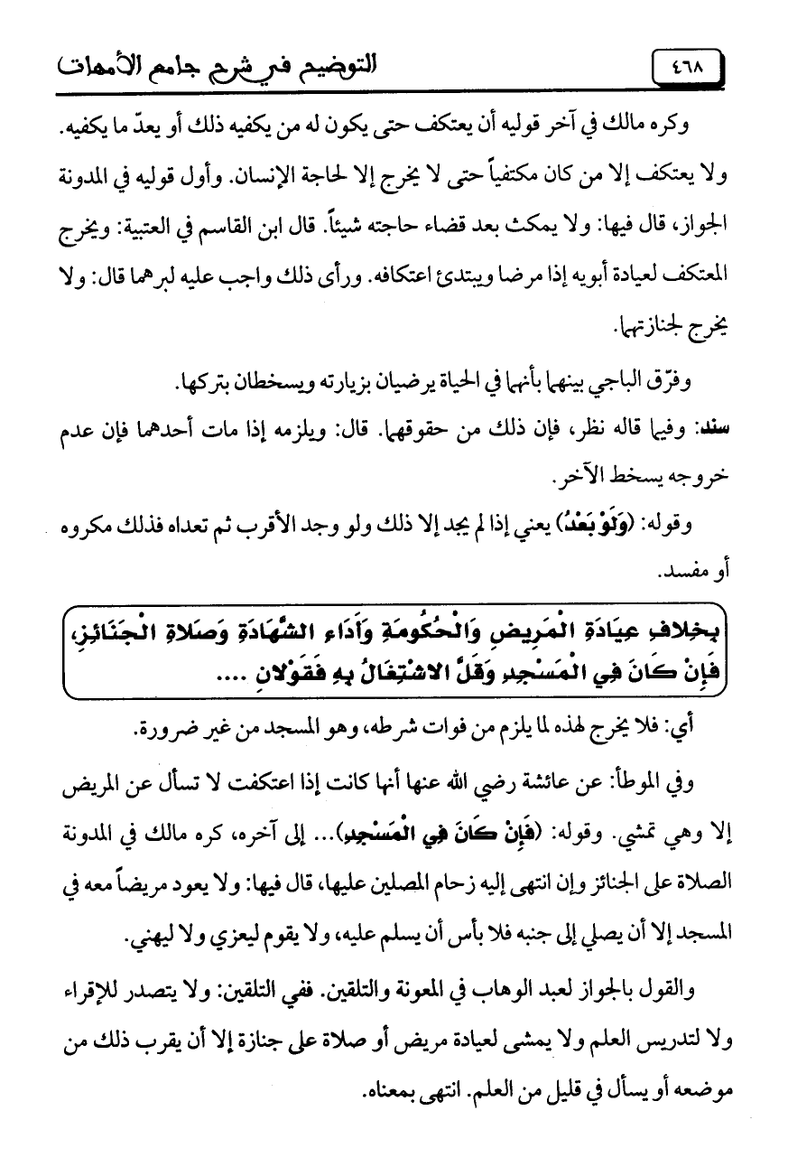 وفي الموطأ: عن عائشة رضي الله عنها أنها كانت إذا اعتكفت لا تسأل عن المريض إلا وهي تمشي. وقوله: (فَإِنْ كَانَ في الْمَسْجِدِ) .. إلى آخره، كره مالك في المدونة الصلاة على الجنائز وإن انتهى إليه زحام المصلين عليها، قال فيها: ولا يعود مريضاً معه في المسجد إلا أن يصلي إلى جنبه فلا بأس أن يسلم عليه، ولا يقوم ليعزي ولا ليهني.