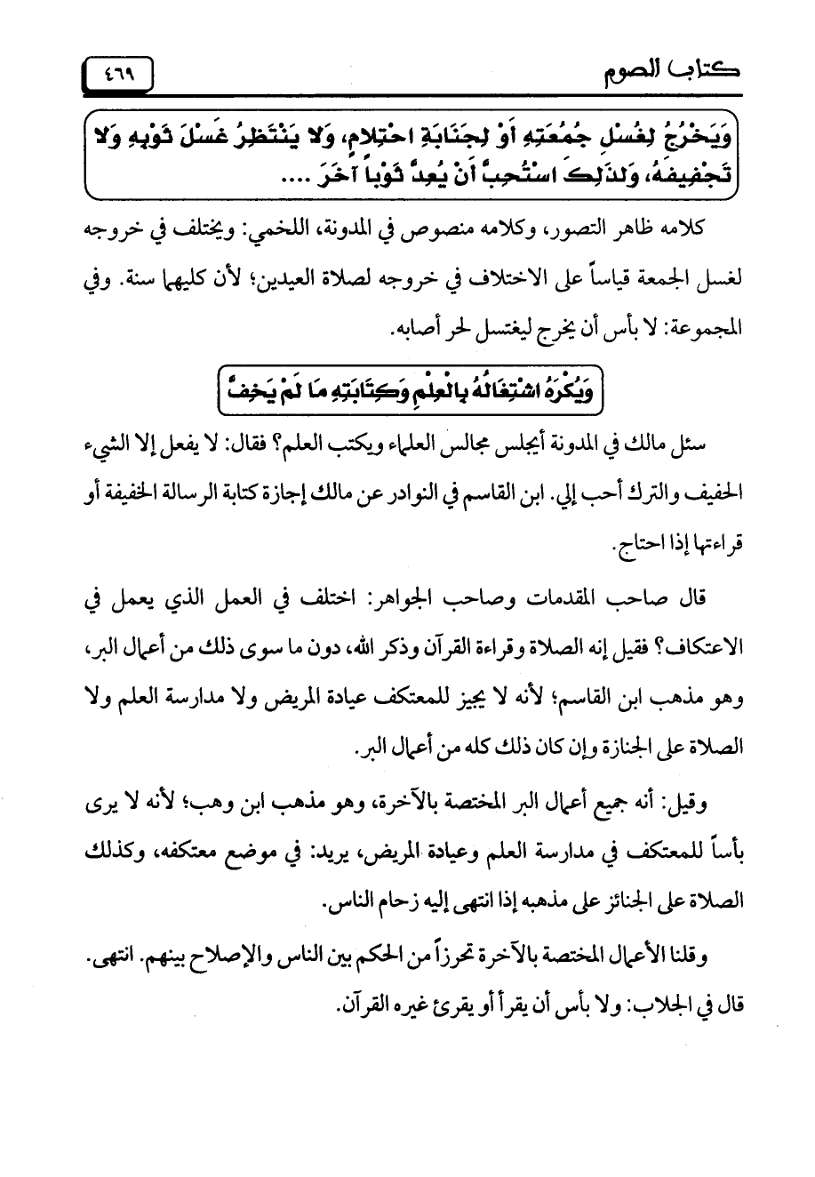 سئل مالك في المدونة أي جلس مجالس العلماء ويكتب العلم؟ فقال: لا يفعل إلا الشيء الحفيف والترك أحب إلي. ابن القاسم في النوادر عن مالك إجازة كتابة الرسالة الخفيفة أو قراءتها إذا احتاج.