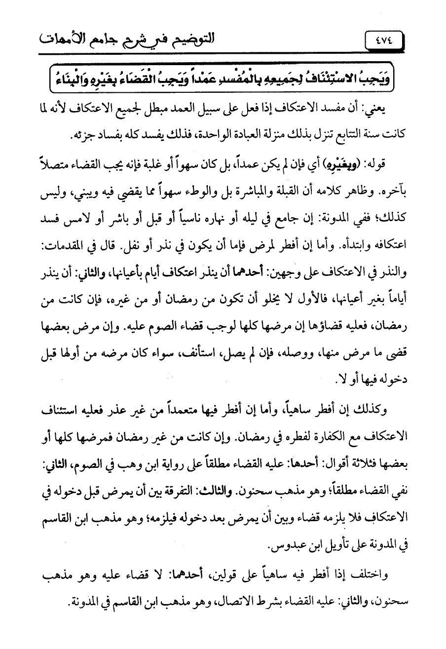 قوله: (وبِغَيْرِهِ) أي فإن لم يكن عمداً، بل كان سهواً أو غلبة فإنه يجب القضاء متصلاً بآخره. وظاهر كلامه أن القبلة والمباشرة بل والوطء سهواً مما يقضي فيه ويبني، وليس كذلك؛ ففي المدونة: إن جامع في ليله أو نهاره ناسياً أو قبل أو باشر أو لامس فسد اعتكافه وابتدأه. وأما إن أفطر لمرض فإما أن يكون في نذر أو نفل. قال في المقدمات: والنذر في الاعتكاف على وجهين: أحدهما أن ينذر اعتكاف أيام بأعيانها، والثاني: أن ينذر أياماً بغير أعيانها، فالأول لا يخلو أن تكون من رمضان أو من غيره، فإن كانت من رمضان، فعليه قضاؤها إن مرضها كلها لوجب قضاء الصوم عليه. وإن مرض بعضها قضى ما مرض منها، ووصله، فإن لم يصل، استأنف، سواء كان مرضه من أولها قبل دخوله فيها أو لا.