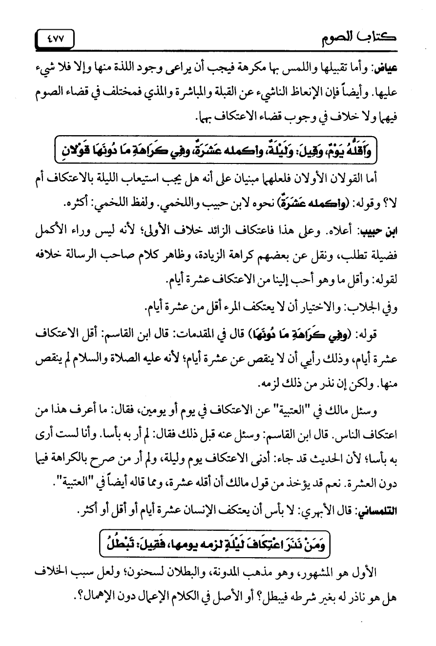 وسئل مالك في "التعبية" عن الاعتكاف في يوم أو يومين، فقال: ما أعرف هذا من اعتكاف الناس. قال ابن القاسم: وسئل عنه قبل ذلك فقال: لم أر به بأسا. وأنا لست أرى به بأسا؛ لأن الحديث قد جاء: أدنى الاعتكاف يوم وليلة، ولم أر من صرح بالكراهة فيما دون العشرة. نعم قد يؤخذ من قول مالك أن أقله عشرة، ومما قاله أيضاً في "العتبية".