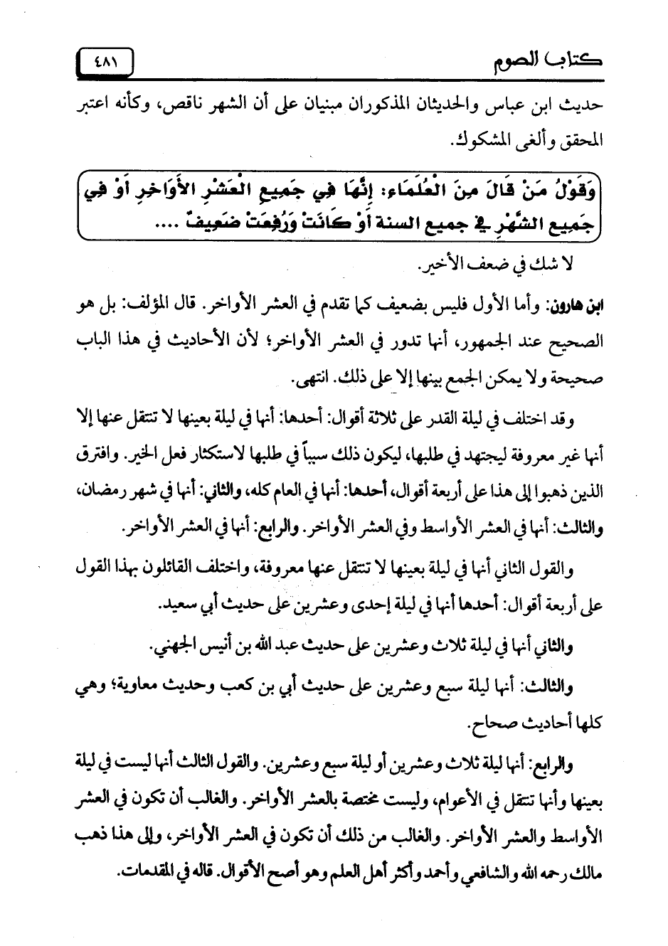 وَقَوْلُ مَنْ قَالَ مِنَ الْعُلَمَاءِ: إِنَّهَا فِي جَمِيعِ الْعَشْرِ الأَوَاخِرِ أَوْ فِي جَمِيع الشَّهْرِ في جميع السنة أَوْ كَانَتْ وَرُفِعَتْ ضَعِيفٌ ....