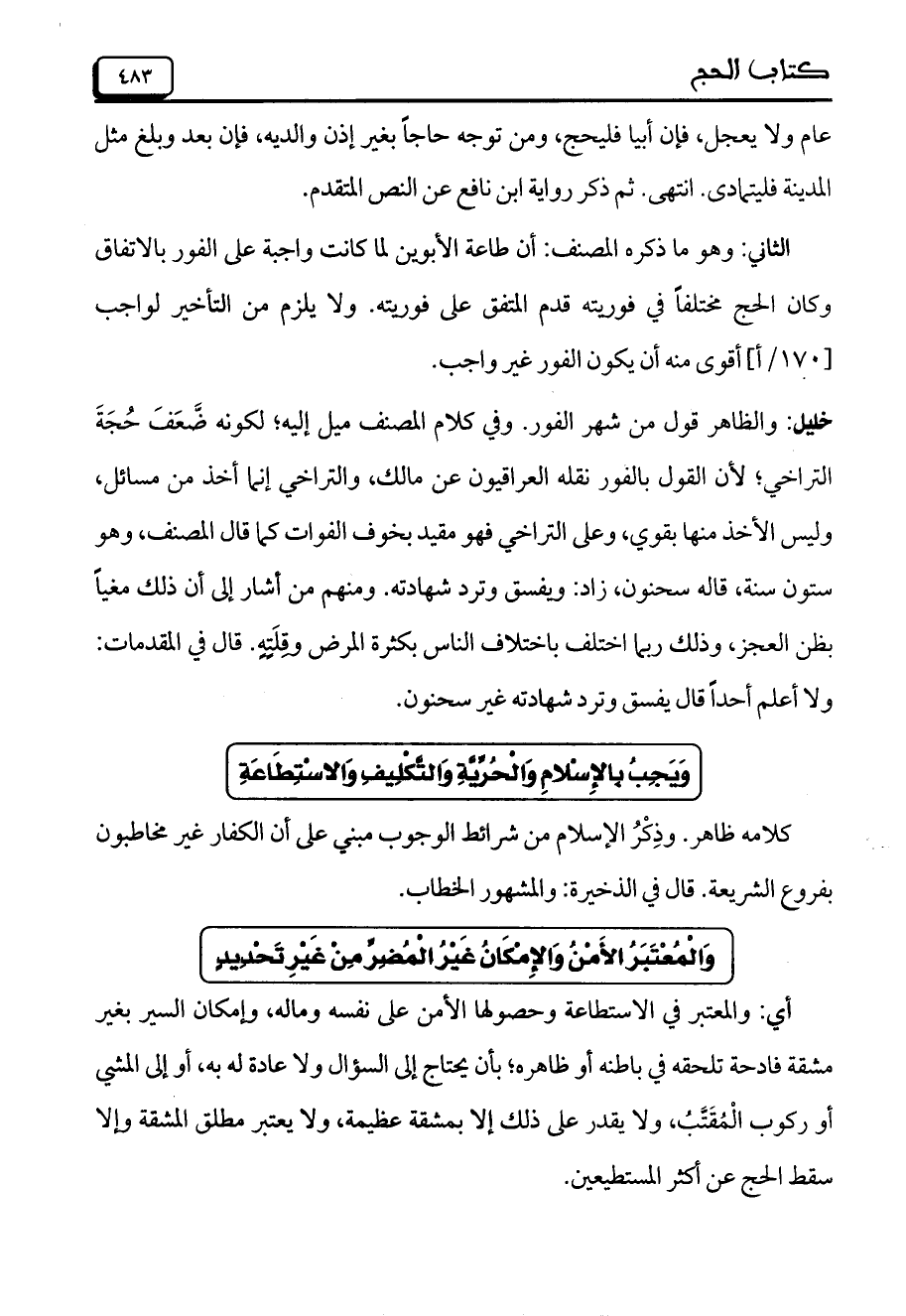 خليل: والظاهر قول من شهر الفور. وفي كلام المصنف ميل إليه؛ لكونه ضَّعَفَ حُجَةَ التراخي؛ لأن القول بالفور نقله العراقيون عن مالك، والتراخي إنما أخذ من مسائل، وليس الأخذ منها بقوي، وعلى التراخي فهو مقيد بخوف الفوات كما قال المصنف، وهو ستون سنة، قاله سحنون، زاد: ويفسق وترد شهادته. ومنهم من أشار إلى أن ذلك مغياً بظن العجز، وذلك ربما اختلف باختلاف الناس بكثرة المرض وقِلَتِهِ. قال في المقدمات: ولا أعلم أحداً قال يفسق وترد شهادته غير سحنون.