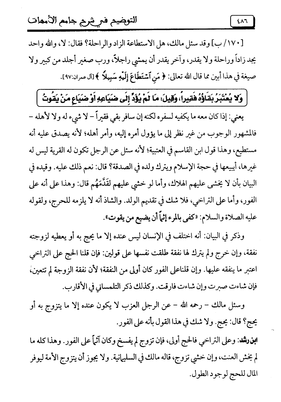 وسئل مالك- رحمه الله – عن الرجل العزب لا يكون عنده إلا ما يتزوج به أو يحج؟ قال: يحج. ولا شك في هذا القول بأنه على الفور.