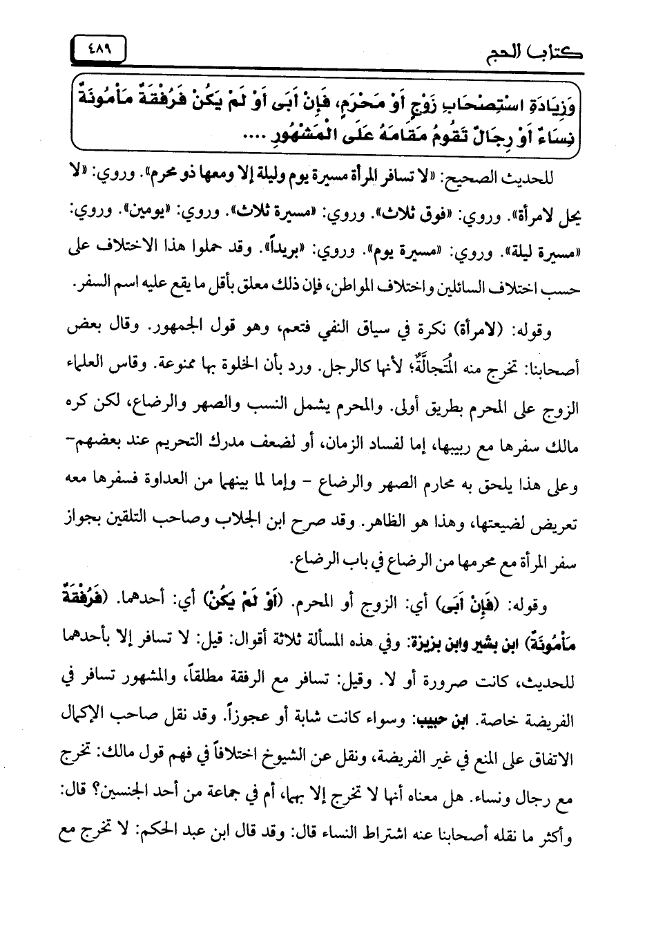 وَزِيادَةِ اِسْتِصْحابِ زَوْجٍ أَوْ مَحْرَمٍ، فَإِنْ أَبَى أَوْ لَمْ يَكُنْ فَرُفْقَةٌ مَامُونَةٌ نَسَاءٌ أَوْ رِجَالٌ تَقُومُ مَقَامَهُ عَلَى الْمَشْهُورِ ...