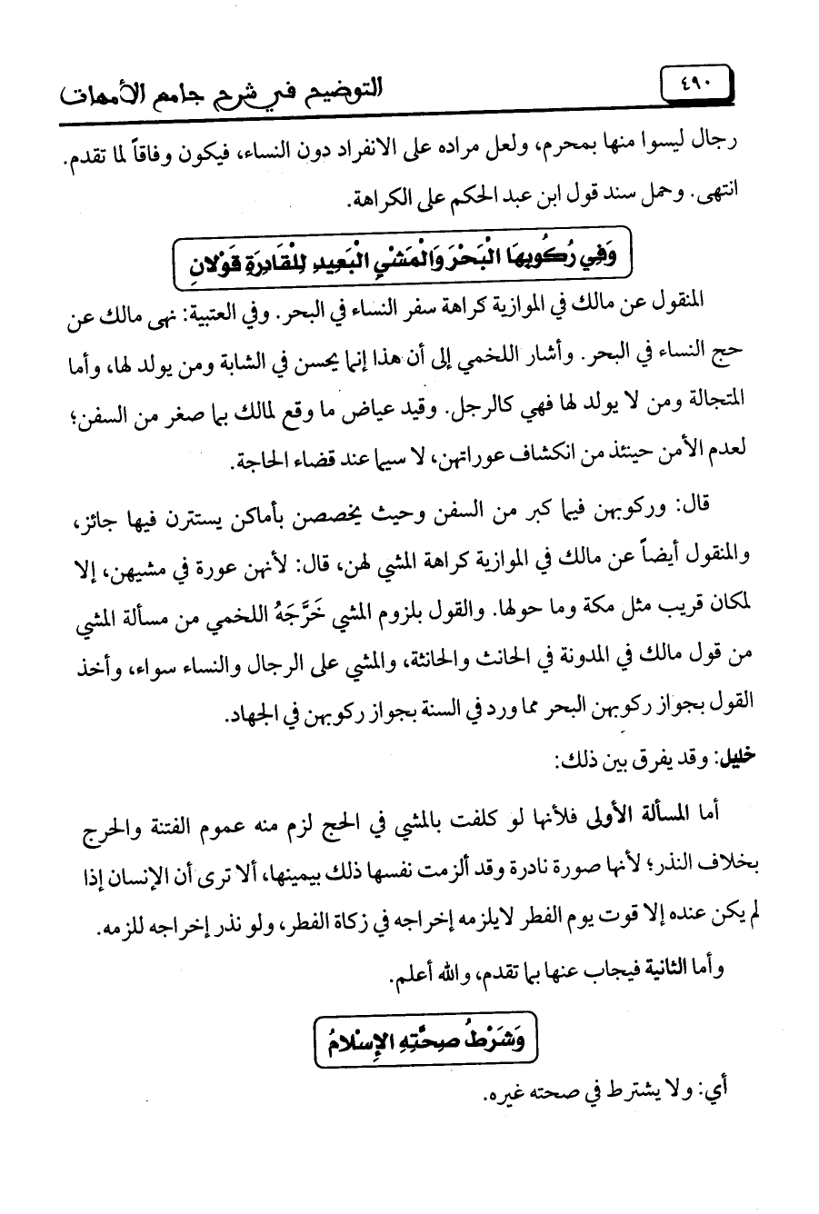 قال: وركوبهن فيما كبر من السفن وحيث يخصصن بأماكن يستترن فيها جائز، والمنقول أيضاً عن مالك في الموازية كراهة المشي لهن، قال: لأنهن عورة في مشيهن، إلا لماكن قريب مثل مكة وما حولها. والقول بلزوم المشي خَرَّجَهُ اللخمي من مسألة المشي من قول مالك في المدونة فيا لحانث والحانثة، والمشي على الرجال والنساء سواء، وأخذ القول بجواز ركوبهن البحر مما ورد في السنة بجواز ركوبهن في الجهاد.