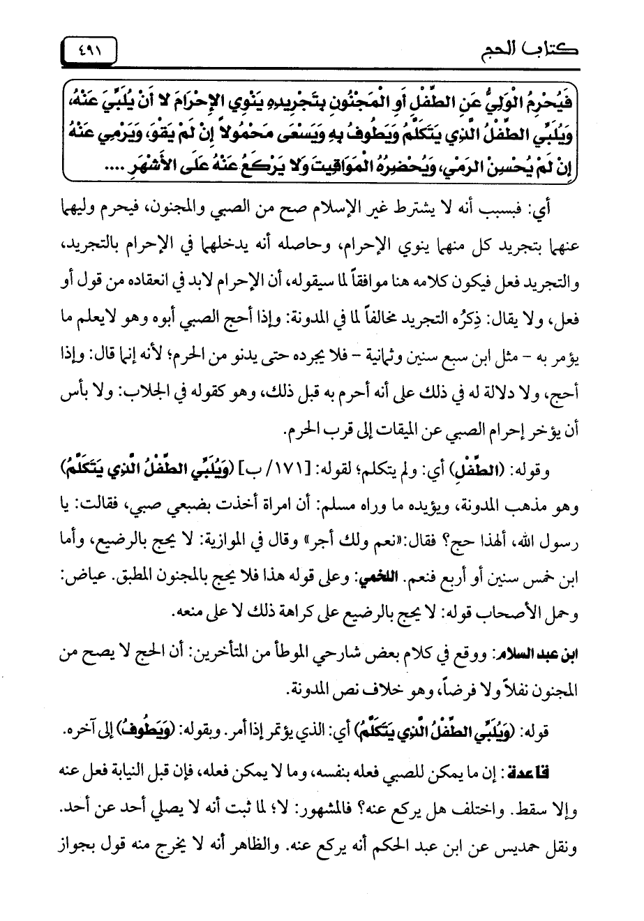 قوله: وَيُلَبِّي الطِّفْلُ الْذِي يَتَكَلَّمُ) أي: الذي يؤتمر إذا أمر. وبقوله: (وَيَطُوفُ) إلى آخره.
