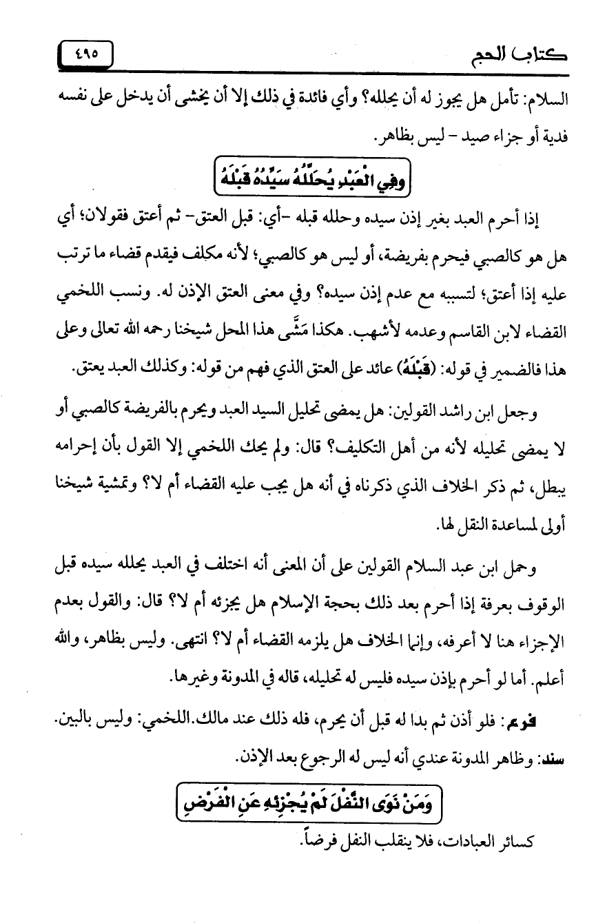 وحمل ابن عبد السلام القولين على أن المعنى أنه اختلف في العبد يحلله سيده قبل الوقوف بعرفة إذا أحرم بعد ذلك بحجة الإسلام هل يجزئه أم لا؟ قال: والقول بعدم الإجزاء هنا لا أعرفه، وإنما الخلاف هل يلزمه القضاء أم لا؟ انتهى. وليس بظاهر، والله أعلم. أما لو أحرم بإذن سيده فليس له تحليله، قاله في المدونة وغيرها.