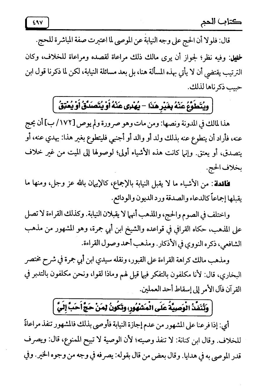 خليل: وفيه نظر؛ لجواز أن يرى مالك ذلك مراعاة لقصده ومراعاة للخلاف، وكان الترتيب يقتضي أن لا يأتي بهذه المسألة هنا، بل بعد مسائلة النيابة، لكن لما ذكرنا قول ابن حبيب ذكرناها لذلك.