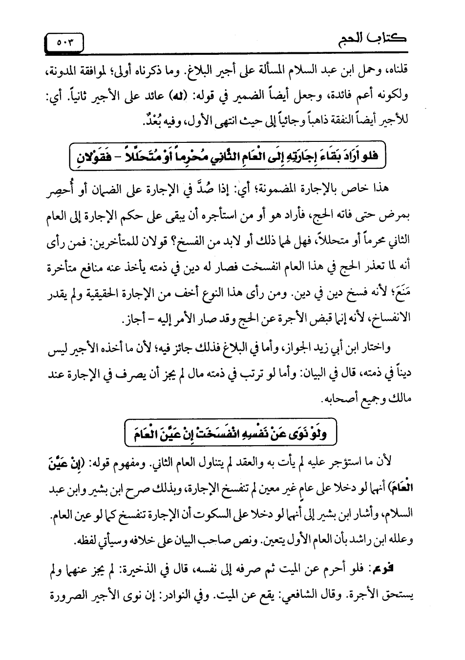 هذا خاص بالإجارة المضمونة؛ أي: إذا صُدَّ في الإجارة على الضمان أو أُحصِر بمرض حتى فاته الحج، فأراد هو أو من استأجره أن يبقى على حكم الإجارة إلى العام الثاني محرماً أو متحللاً، فهل لهما ذلك أو لابد من الفسخ؟ قولان للمتأخرين: فمن رأى أنه لما تعذر الحج في هذا العام انفسخت فصار له دين في ذمته يأخذ عنه منافع متأخرة مَنَع؛ لأنه فسخ دين في دين. ومن رأى هذا النوع أخف من الإجارة الحقيقية ولم يقدر الانفساخ، لأنه إنما قبض الأجرة عن الحج وقد صار الأمر إليه –أجاز.