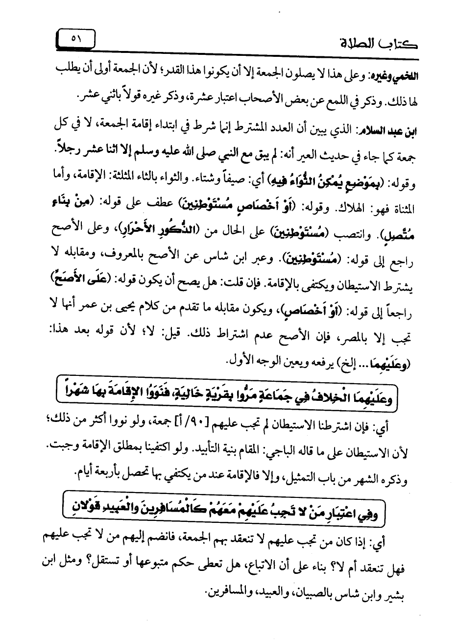 ابن عبد السلام: الذي يبين أن العدد المشترط إنما شرط في ابتداء إقامة الجمعة، لا في كل جمعة كما جاء في حديث العير أنه: لم يبق مع النبي صلى الله عليه وسلم إلا اثنا عشر رجلاً. وقوله: (بِمَوْضِعٍ يُمْكِنُ التُّوَاءُ) أي: صيفاً وشتاء. والثواء بالثاء المثلثة: الإقامة، وأما المثناة فهو: الهلاك. وقوله: (أَوْ أَخْصَاصٍ مُسْتَوْطِنِينَ) عطف على قوله: (مِنْ بِنَاءٍ مُتَّصِلٍ). وانتصب (مُسْتَوْطِنِينَ) على الحال من (الذُّكُورِ الأَحْرَارِ)، وعلى الأصح راجع إلى قوله: (مُسْتَوْطِنِينَ). وعبر ابن شاس عن الأصح بالمعروف، ومقابله لا يشترط الاستيطان ويكتفي بالإقامة. فإن قلت: هل يصح أن يكون قوله: (عَلَى الأَصَحِّ) راجعاً إلى قوله: (أَوْ أَخْصَاصٍ)، ويكون مقابله ما تقدم من كلام يحيى بن عمر أنها لا تجب إلا بالمصر، فإن الأصح عدم اشتراط ذلك. قيل: لا؛ لأن قوله بعد هذا: (وعَلَيْهِمَا ... إلخ) يرفعه ويعين الوجه الأول.