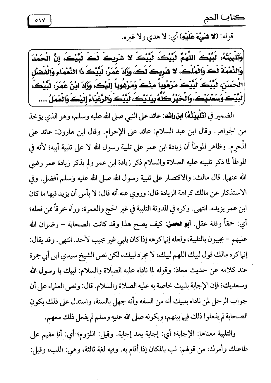 وَتَلْبيَتُهُ: لَبَّيْكَ اللَّهُمِّ لَبَّيْكَ، لَبَّيْكَ لا شَرِيكَ لَكَ لَبَّيْكَ، إِنَّ الْحَمْدَ وَالنِّعْمَةَ لَكَ وَالْمُلْكَ، لَا شَرِيكَ لَكَ، وَزَادَ عُمَرُ: لَبَّيْكَ ذََا النَّعْمَاءِ وَالْفَضْلِ الْحَسَنِ، لَبَّيْكَ لَبَّيْكَ مَرْهُوباً مِنْكَ وَمَرْغُوباً إِلَيْكَ، وَزَادَ اِبْنُ عُمَرَ: لَبَّيْكَ، لَبَّيْكَ وَسَعْدَيْكَ، وَالْخَيْرُ كُلُّهُ بِيَدِيْكَ، لَبَّيْكَ وَالرَّغْبَاءُ إِلَيْكِ وَالْعَمَلُ ....