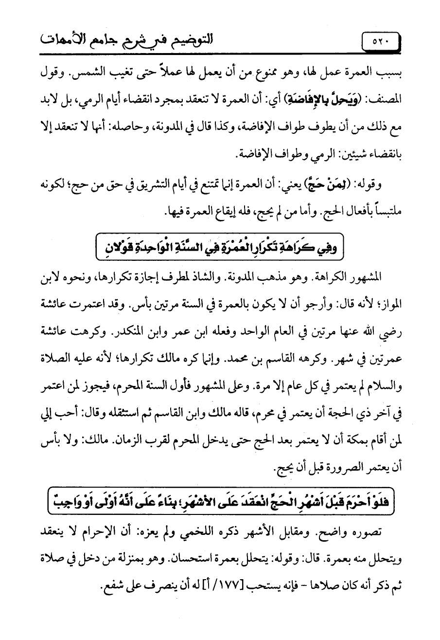 المشهور الكراهة. وهو مذهب المدونة. والشاذ لمطرف إجازة تكرارها، ونحوه لابن المواز؛ لأنه قال: وأرجو أن لا يكون بالعمرة في السنة مرتين بأس. وقد اعتمرت عائشة رضي الله عنها مرتين في العام الواحد وفعله ابن عمر وابن المنكدر. وكرهت عائشة عمرتين في شهر. وكرهه القاسم بن محمد، وإنما كره مالك تكرارها؛ لأنه عليه الصلاة والسلام لم يعتمر في كل عام إلا مرة. وعلى المشهور فأول السنة المحرم، فيجوز لمن اعتمر في آخر ذي الحجة أن يعتمر في محرم، قاله مالك وابن القاسم ثم استثقله وقال: أحب إلي لمن أقام بمكة أن لا يعتمر بعد الحج حتى يدخل المحرم لقرب الزمان. مالك: ولا بأس أن يعتمر الصرورة قبل أن يحج.