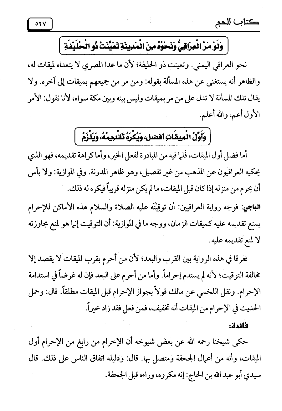 حكى شيخنا رحمه الله عن بعض شيوخه أن الإحرام من رابغ من الإحرام أول الميقات، وأنه من أعمال الجحفة ومتصل بها. قال: ودليله اتفاق الناس على ذلك. قال سيدي أبو عبد الله بن الحاج: إنه مكروه، وراءه قبل الجحفة.
