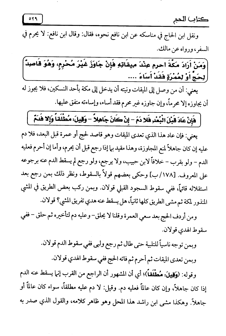 يعني: فإن عاد هذا الذي تعدى الميقات وهو قاصد لحج أو عمرة قبل البعد، فلا دم عليه إن كان جاهلاً لمنع المجاوزة، وهذا مقيد بما إذا رجع قبل أن يحرم، وأما إن أحرم فعليه الدم- ولو بقرب – خلافاً لابن حبيب، ولا يرجع، ولو رجع لم يسقط الدم عنه برجوعه على المعروف. [178/ب] وحكى بعضهم قولاً بالسقوط، ونظر ذلك بمن رجع بعد استقلاله قائماً، ففي سقوط السجود القبلي قولان. وبمن ركب بعض الطريق في المشي المنذور لمكة ثم مشى الطريق كلها ثانياً، هل يسقط عنه هدي تفريق المشي؟ قولان.