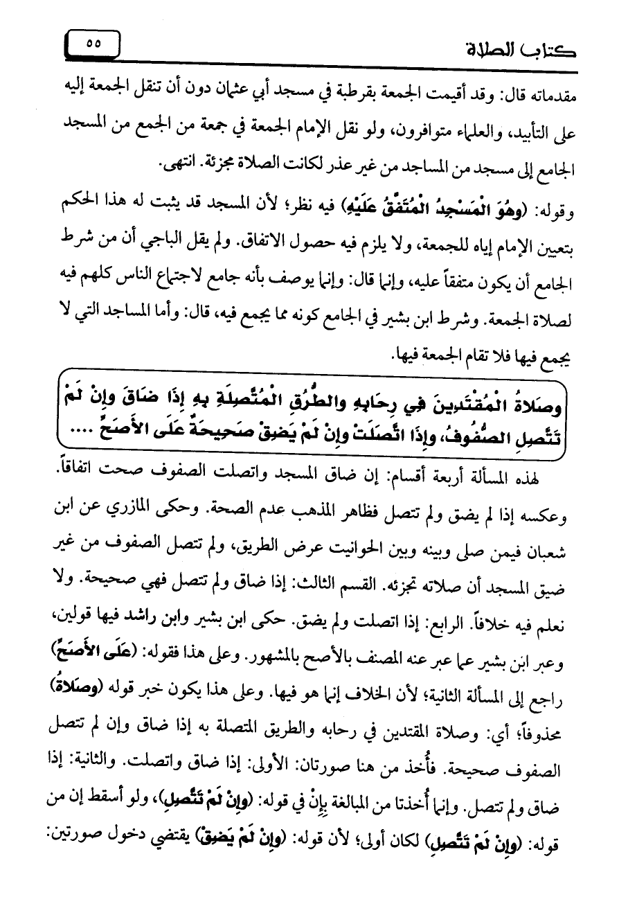 مقدماته قال: وقد أقيمت الجمعة بقرطبة في مسجد أبي عثمان دون أن تنقل الجمعة إليه على التأبيد، والعلماء متوافرون، ولو نقل الإمام الجمعة في جمعة من الجمع من المسجد الجامع إلى مسجد من المساجد من غير عذر لكانت الصلاة مجزئة. انتهى.
