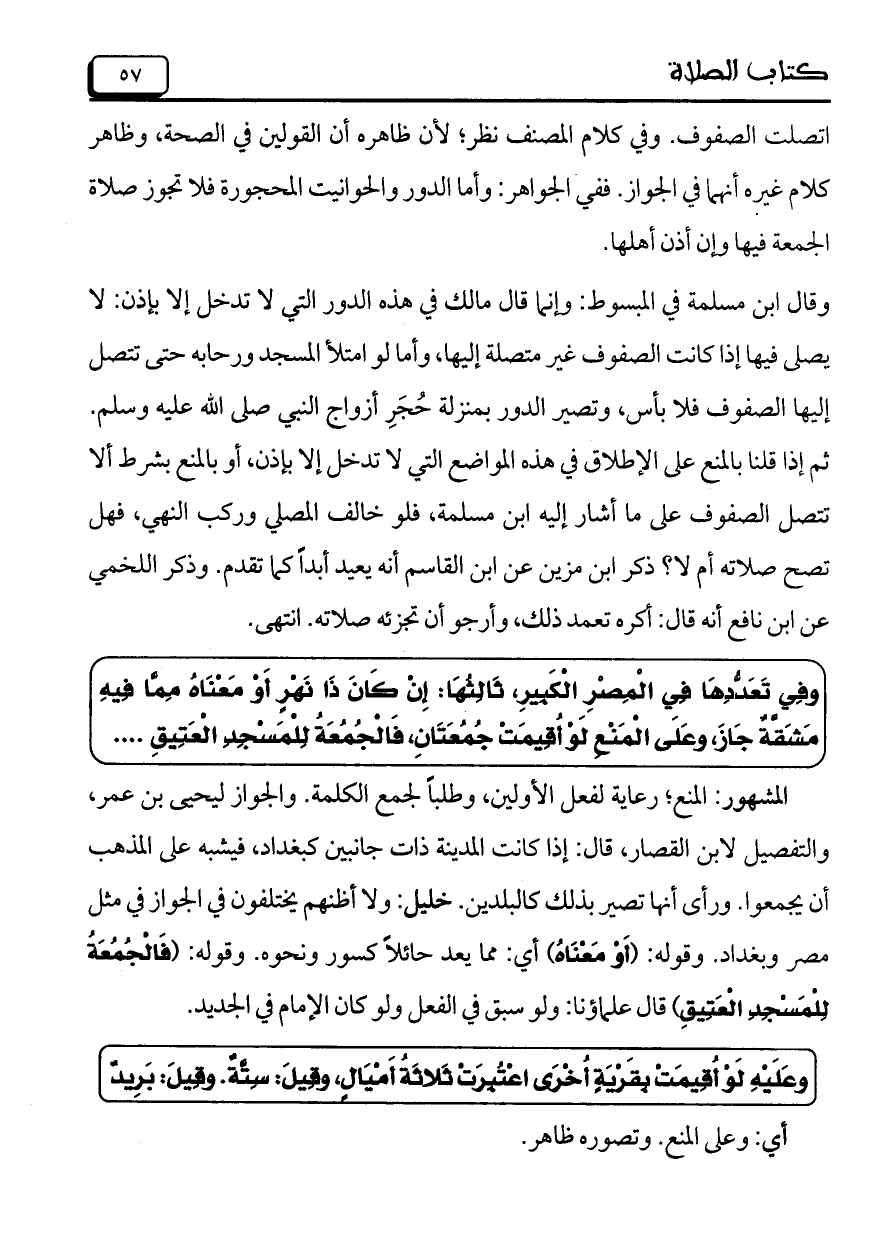 المشهور: المنع؛ رعاية لفعل الأولين، وطلباً لجمع الكلمة. والجواز ليحيى بن عمر، والتفصيل لابن القصار، قال: إذا كانت المدينة ذات جانبين كبغداد، فيشبه على المذهب أن يجمعوا. ورأى أنها تصير بذلك كالبلدين. خليل: ولا أظنهم يختلفون في الجواز في مثل مصر وبغداد. وقوله: (أَوْ مَعْنَاهُ) أي: مما يعد حائلاً كسور ونحوه. وقوله: (فَالْجُمُعَةُ لِلْمَسْجِدِ الْعَتِيقِ) قال علماؤنا: ولو سبق في الفعل ولو كان الإمام في الجديد.