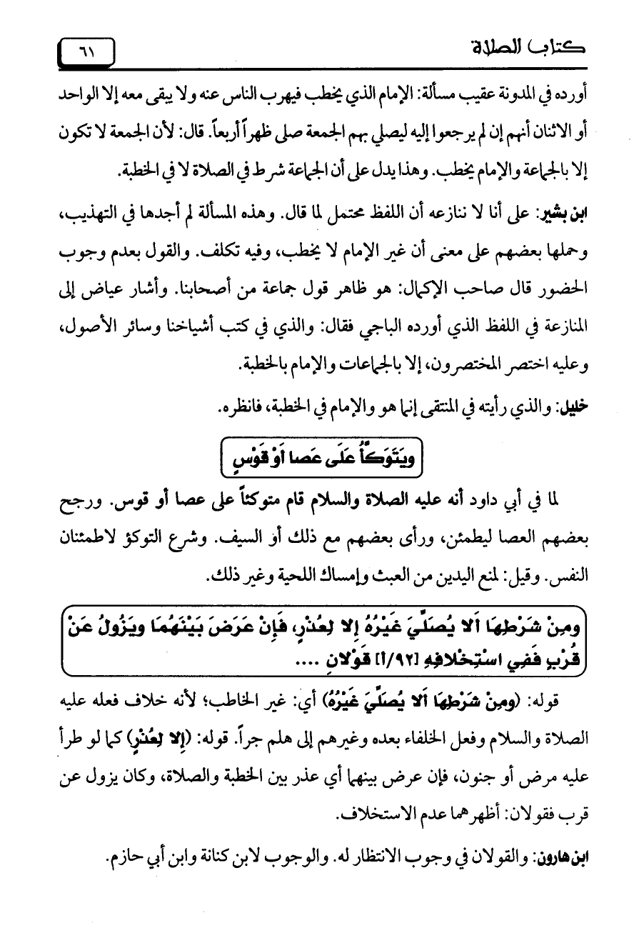 ومِنْ شَرْطِهَا أَلا يُصَلَّيَ غَيْرُهُ إِلا لِعُذْرٍ، فَإِنْ عَرَضَ بَيْنَهُمَا ويَزُولُ عَنْ قُرْبٍ فَفِي اسْتِخْلافِهِ] 92/أ [قَوْلانِ ...