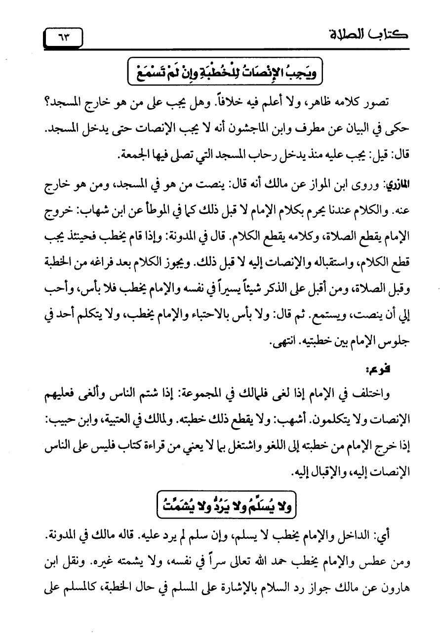 المازري: وروى ابن المواز عن مالك أنه قال: ينصت من هو في المسجد، ومن هو خارج عنه. والكلام عندنا يحرم بكلام الإمام لا قبل ذلك كما في الموطأ عن ابن شهاب: خروج الإمام يقطع الصلاة، وكلامه يقطع الكلام. قال في المدونة: وإذا قام يخطب فحينئذ يجب قطع الكلا، واستقباله والإنصات إليه لا قبل ذلك. ويجوز الكلام بعد فراغه من الخطبة وقبل الصلاة، ومن أقبل على الذكر شيئاً يسيراً في نفسه والإمام يخطب فلا بأس، وأحب إلى أن ينصت، ويستمع. ثم قال: ولا بأس بالاحتباء والإمام يخطب، ولا يتكلم أحد في جلوس الإمام بين خطبتيه. انتهى.