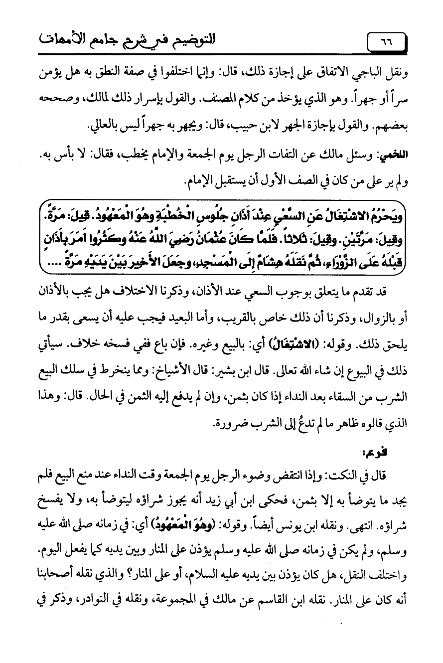 قال في النكت: وإذا انتقض وضوء الرجل يوم الجمعة وقت النداء عند منع البيع فلم يجد ما يتوضأ به إلا بثمن، فحكى ابن أبي زيد أنه يجوز شراؤه ليتوضأ به، ولا يفسخ شراؤه. انتهى. ونقله ابن يونس أيضاً. وقوله: (وهُوَ الْمَعْهُودُ) أي: في زمانه صلى الله عليه وسلم، ولم يكن في زمانه صلى الله عليه وسلم يؤذن على المنار وبين يديه كما يفعل اليوم. واختلف النقل، هل كان يؤذن بين يديه عليه السلام، أو على المنار؟ والذي نقله أصحابنا أنه كان على المنار. نقله ابن القاسم عن مالك في المجموعة، ونقله في النوادر، وذكر في