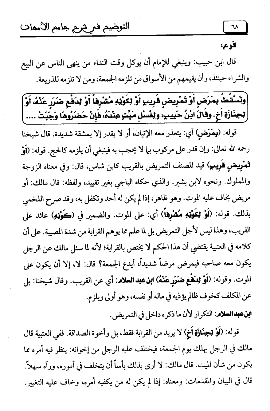 قوله: (بِمَرَضٍ) أي: يتعذر معه الإتيان، أو لا يقدر إلا بمشقة شديدة. قال شيخنا رحمه الله تعالى: وإن قدر على مركوب بما لا يحجب به فينبغي أن يلزمه كالحج. قوله: (أَوْ تَمْرِيضٍ قَرِيبٍ) قيد المصنف التمريض بالقريب كابن شاس، قال: وفي معناه الزوجة والمملوك. ونحوه لابن بشير. والذي حكاه الباجي بغير تقييد، ولفظه: قال مالك، أو مريض يخاف عليه الموت. وهو ظاهر، إذا لم يكن له أحد وتكفل به، وقد صرح اللخمي بذلك. قوله: (أَوْ لِكَوْنِهِ مُشْرِفاً) أي: على الموت. والضمير في (كَوْنِهِ) عائد على القريب، وهذا ليس لأجل التمريض بل لما علم مما يوهم القرابة من شدة المصيبة. على أن كلامه في العتبية يقتضي أن هذا الحكم لا يختص بالقرابة؛ لأنه لما سئل مالك عن الرجل يكون معه صاحبه فيمرض مرضاً شديداً، أيدع الجمعة؟ قال: لا، إلا أن يكون على الموت. وقوله: (أَوْ لِدَفْعِ ضَرَرٍ عَنْهُ) ابن عبد السلام: أي عن القريب. وقال شيخنا: بل عن المكلف كخوف ظالم يؤذيه في ماله أو نفسه، وهو أولى ويلزم.