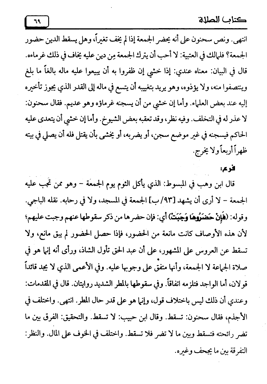 انتهى. ونص سحنون على أنه يحضر الجمعة إذا لم يخف تغيراً، وهل يسقط الدين حضور الجمعة؟ فلمالك في العتبية: لا أحب أن يترك الجمعة من دين عليه يخاف في ذلك غرماءه. قال في البيان: معناه عندي: إذا خشي إن ظفروا به أن يبيعوا عليه ماله بالغاً ما بلغ وينتصفوا منه، ولا يؤذوه، وهو يريد بتغييبه أن يتسع في ماله إلى القدر الذي يجوز تأخيره إليه عند بعض العلماء. وأما إن خشي من أن يسجنه غرماؤه وهو عديم. فقال سحنون: لا عذر له في التخلف. وفيه نظر، وقد تعقبه بعض الشيوخ. وأما إن خشي أن يتعدي عليه الحاكم فيسجنه في غير موضع سجن، أو يضربه، أو يخشى بأن يقتل فله أن يصلي في بيته ظهراً أربعاً ولا يخرج.